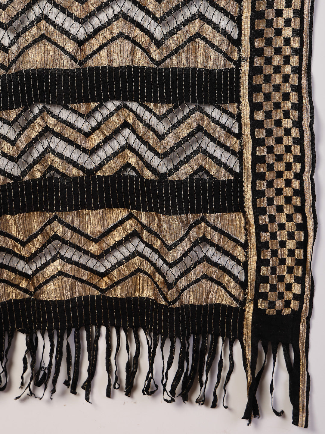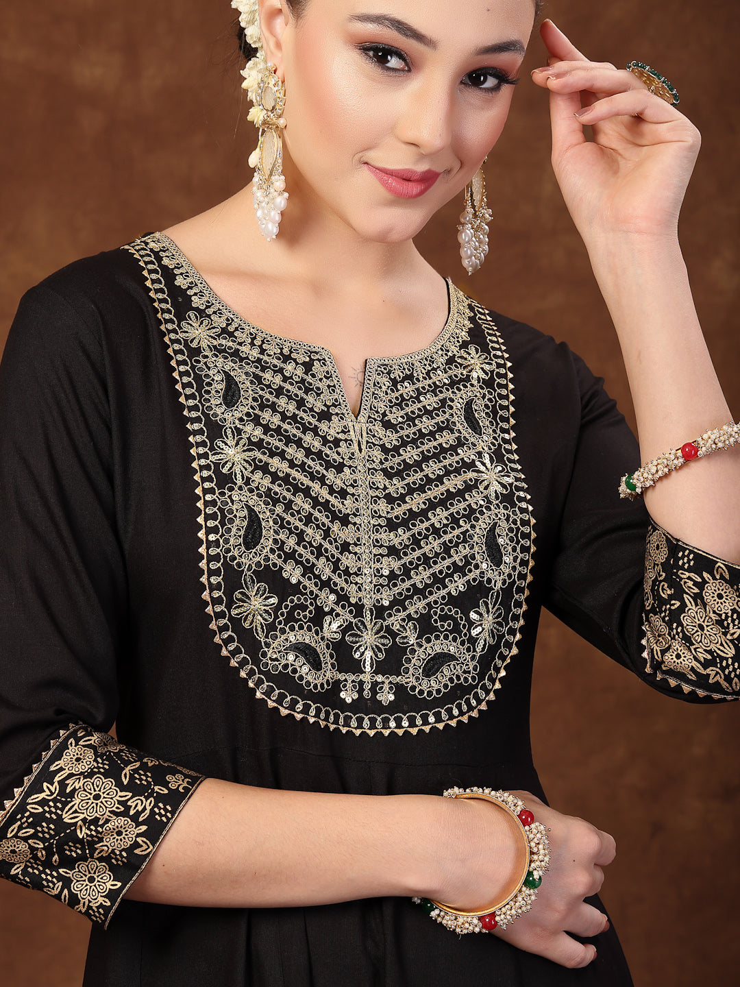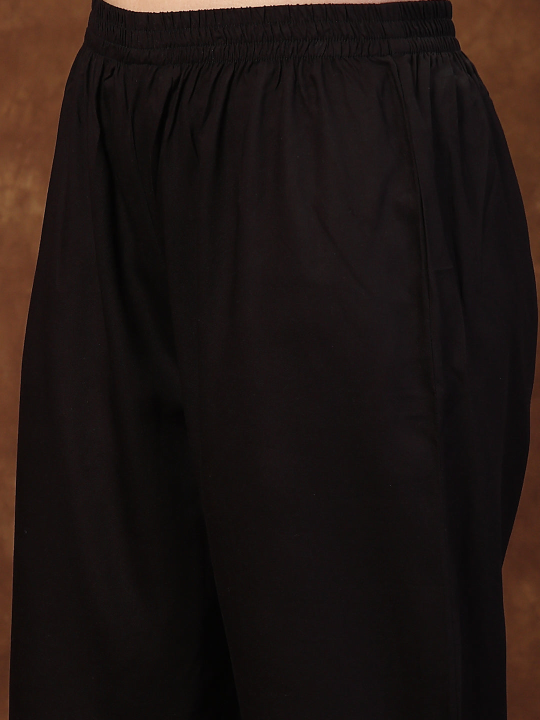 Festive black solid anarkali kurta pant dupatta set. Kurta has dori embroidered yoke. Printed border on sleeves, flair and pant. Soild Pant is fully elasticated. Paired with fancy soft brocade dupatta. Kurta Length- 47" Inch, Pant Length - 38'' Inch, Dupatta Length - 2.30 Mtr.