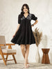 Black solid embroidered midi dress in rayon fabric. It has V-neckline, half puffed sleeves with gathers. Dress length -38'' Inch.