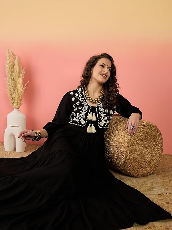 Stylum Women's Black Solid & Embroidered Rayon Tiered Dress with Jacket (DRSBLACKKAYN)