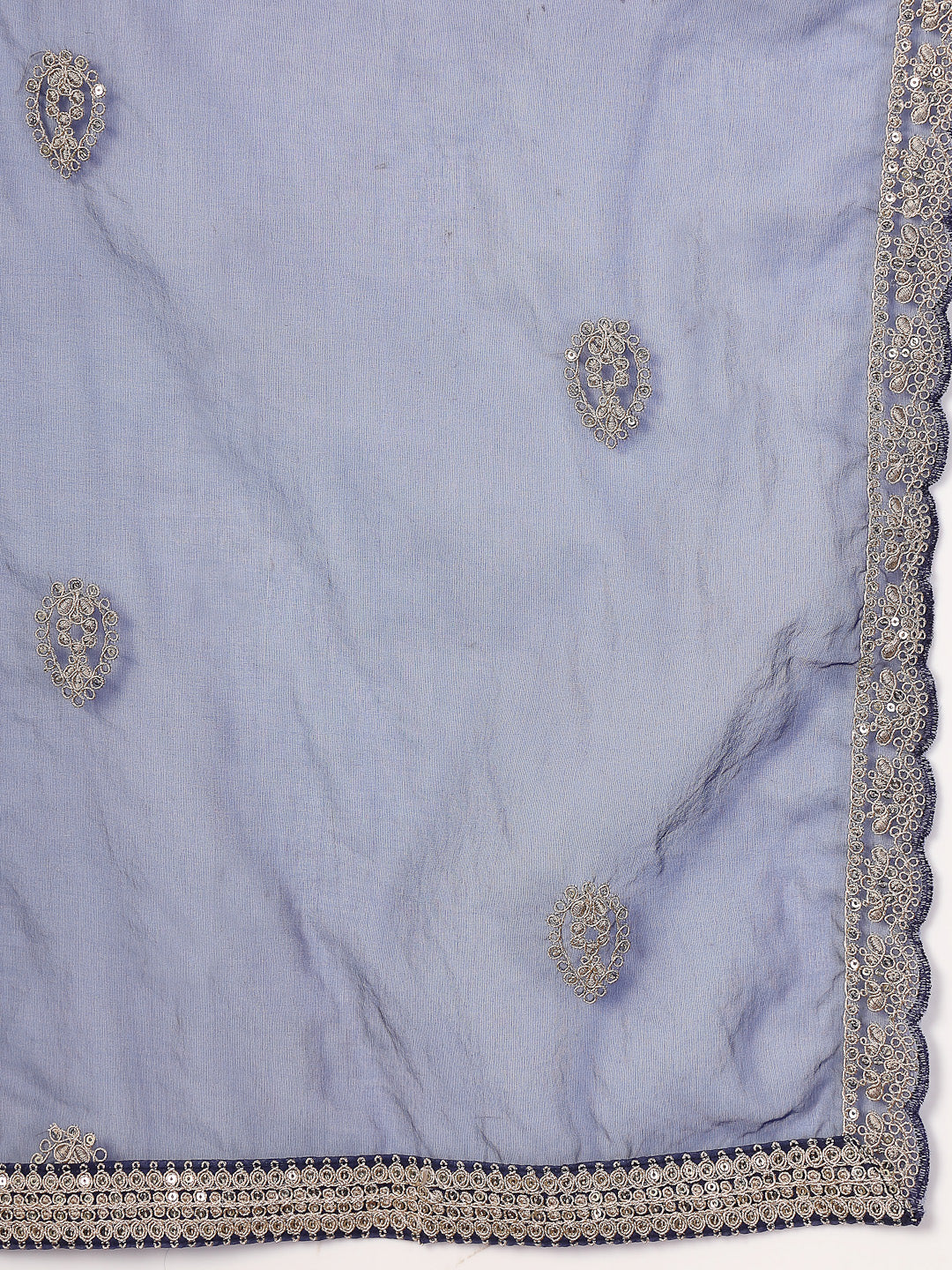 Festive blue bandhani printed silk blend straight kurta pant dupatta set. Kurta has embroidery on v-neck line. It has embroidered beautiful border attachment on sleevs. Bandhani printed pant has fully elasticated waistband and organza Embroiderd dupatta . Kurta Length- 45" Inch, Pant Length - 38'' Inch, Dupatta Length - 2.25 Mtr.