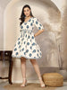 Blue and off white boho printed a-line mini dress. This V-neck cocktail dress has belt tie-up. Length -38''. Casual wear to outing wear dress.