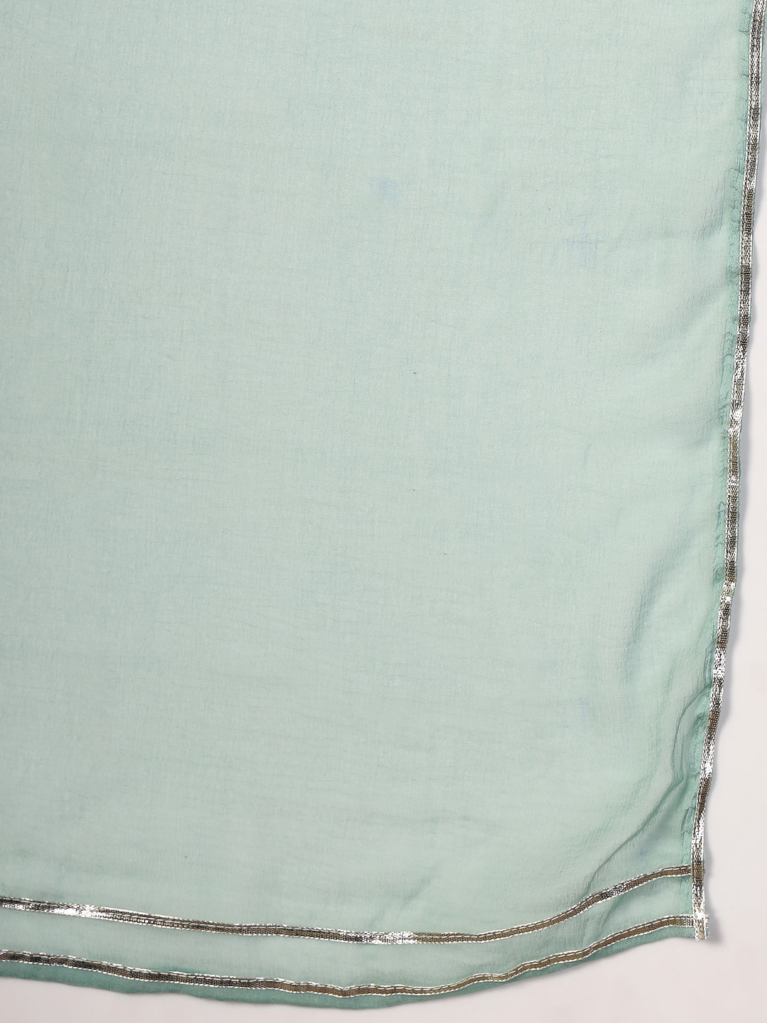 Floral printed blue rayon Alia cut kurta pant and dupatta set. Designed with beautiful embroidery detailing. It has 3/4 sleeves & fully elasticated rayon printed palazzo. Paired with chiffon shaded dupatta. Kurta Length- 48" Inch, Pant Length - 38'' Inch, Dupatta Length - 2.30 mtr.