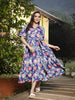 Blue floral printed calf length tiered dress in rayon fabric. It is shirt collar and half sleeves dress has full button placket with tie-up belt in waist. Dress Length- 48'' Inch.