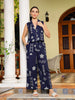 Blue rayon slub geomatric printed co-ord set. Top has button on it, coat collar and sleeveless with paired with rayon blend half elasticated waistbelt pant. Top Length- 20'' Inch, Pant Length- 38" Inch.