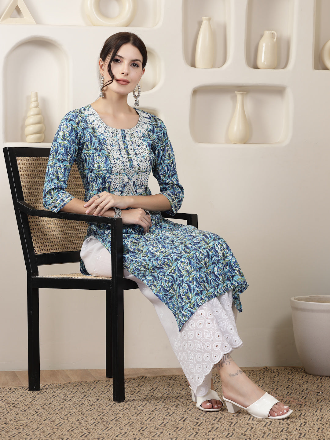Stylum Women's Blue Printed & Embroidered Rayon Straight Chicken Kurta (BLUETONY)