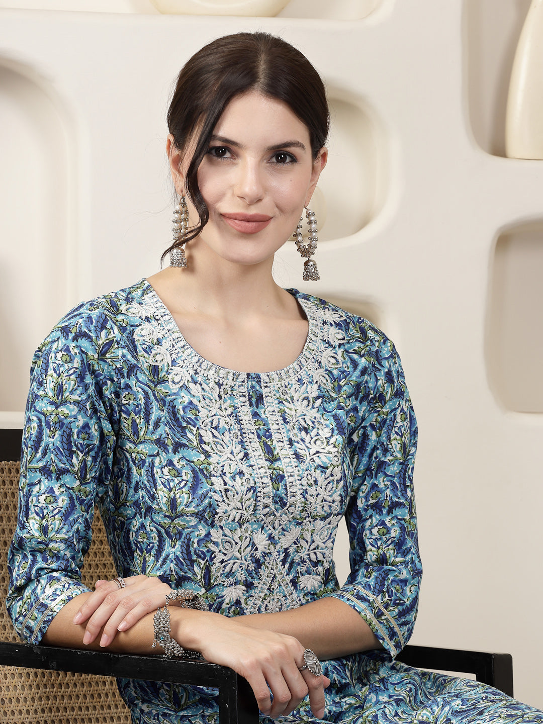 Festive blue printed rayon straight kurta. Kurta has beautiful chikankari embroidery on yoke and gota detailing on sleeve, Kurta Length- 45" Inch.