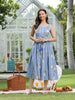 Blue striped and floral printed cotton dress. Dress has Round Neck with tesseles belt. Sleeveless with Strapy Sleeves Dress Length- 45'' Inch.