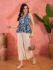 Blue tropical printed v-neck and shoulder tie-ups co-ord set. Comfy soft cotton mul fabric for summers. Top has tassles on it. Cotton blend solid pant. Top Length- 25'' Inch, Pant Length- 38'' Inch.