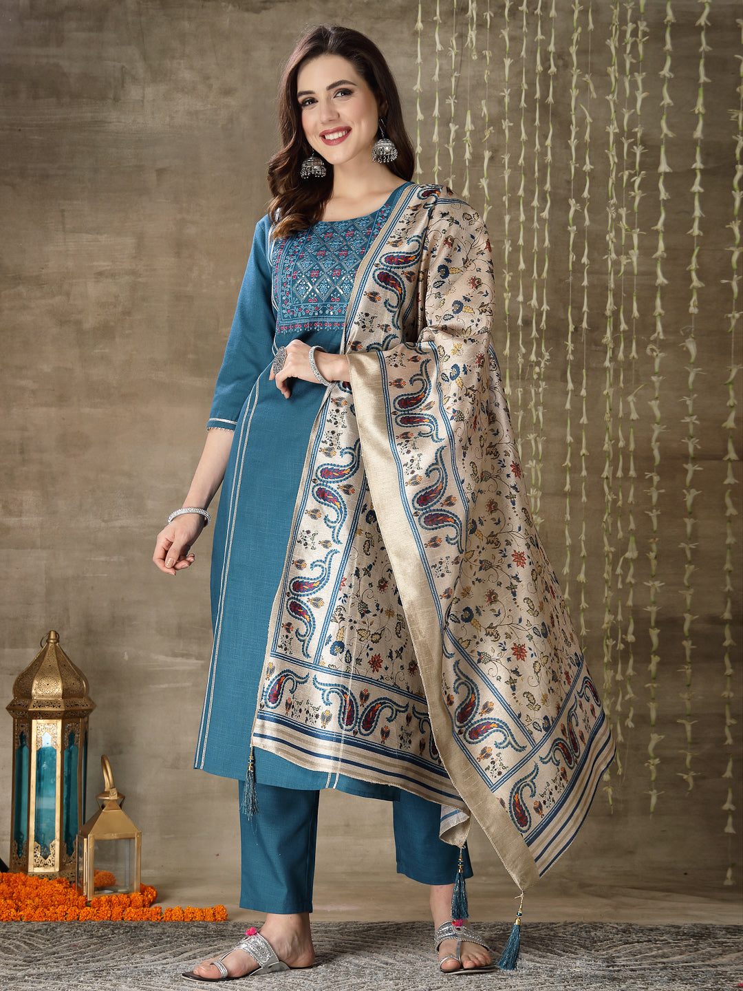Stylum Women's Embroidered Cotton Blend Straight Kurta Pant Dupatta Set (KPDBHUMI)