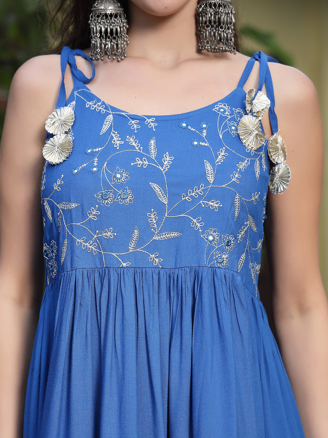 Solid Blue tiered long kurta dress in cotton fabric. Tie-ups on shoulder with gota phools. Mirror and zari embroidery on full yoke. Viscose dyed lurex dupatta. Products Kurta Length-52" inch. Dupatta Length- 2.30 Mtr.