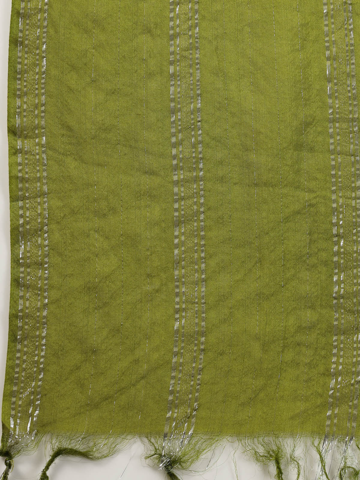 Solid Green tiered long kurta dress in cotton fabric. Tie-ups on shoulder with gota phools. Mirror and zari embroidery on full yoke. Viscose dyed lurex dupatta. Products Kurta Length-52" inch. Dupatta Length- 2.30 Mtr.