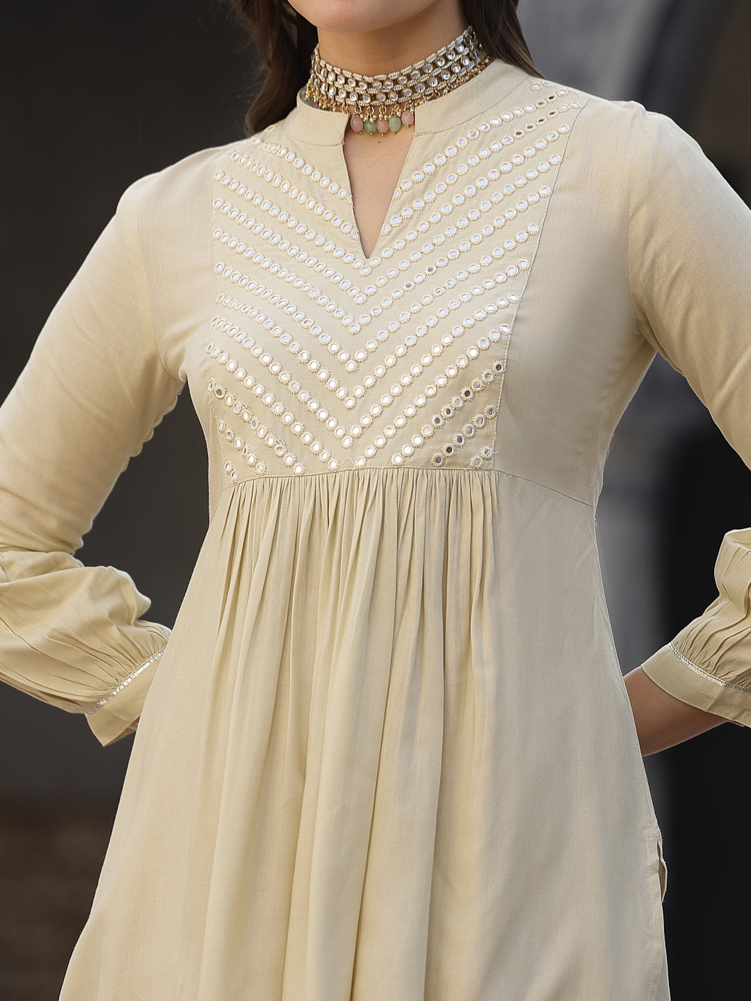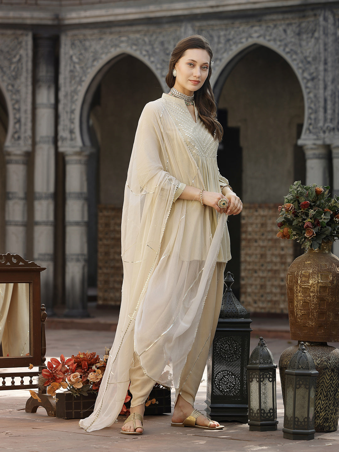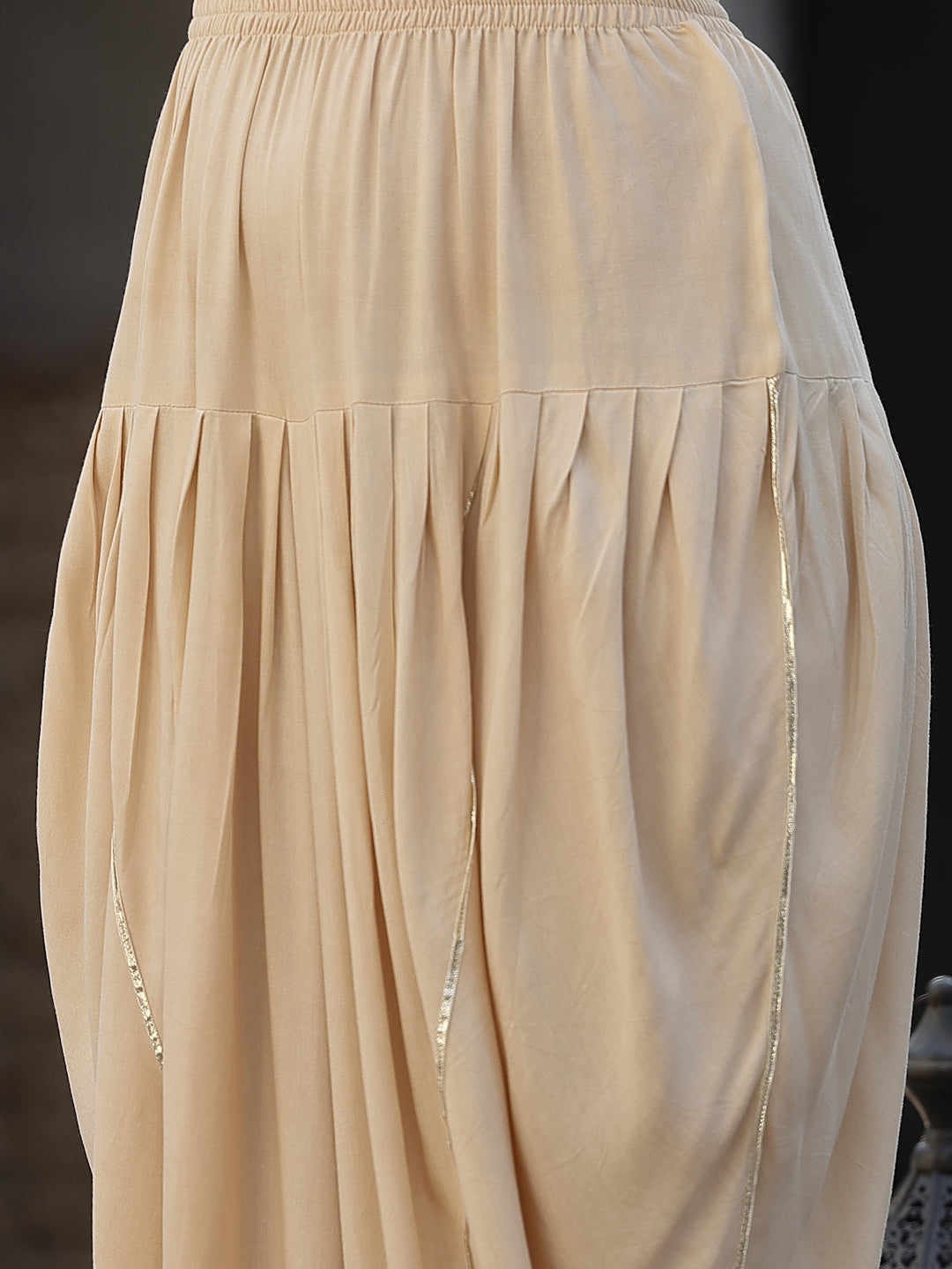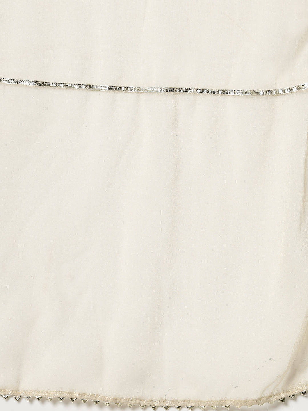 Solid Cream kurta dhoti pant & dupatta set in Rayon fabric. Puffed sleeves pattern. Beautiful mirror embroidery on neckline. Lace attached on gheri and sleeves. Solid dhoti has full elasticated waist. Solid chiffon dupatta with lace attached. Kurta Length- 34" Dhoti length - 39''. Dupatta length - 2.30 mtr. Festive wear outfit.