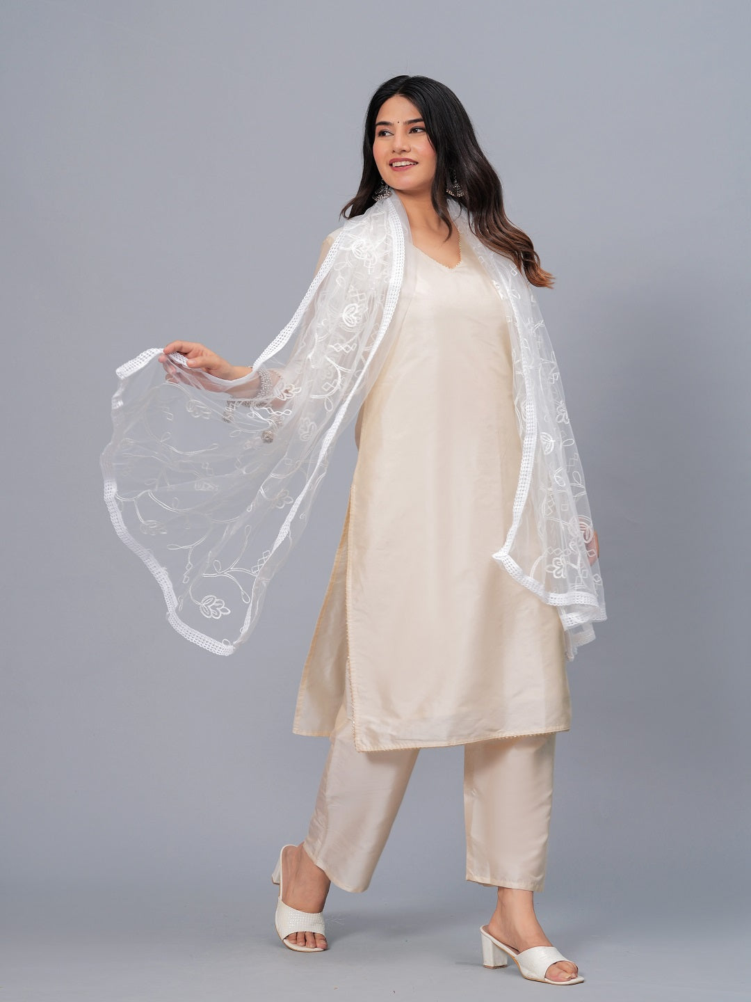 This beautiful net white embroidered dupatta detailed with lace hem will enhance your look. Pair it with kurti or tunic and mojaris for a charming appeal. You can draw the dupatta in any color. Dupatta Length:- 2.25 Mtr