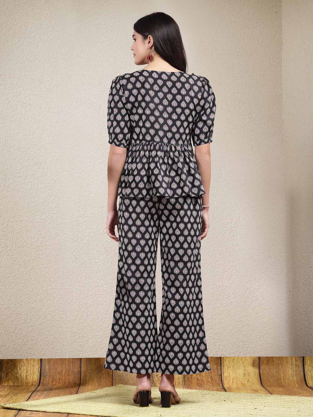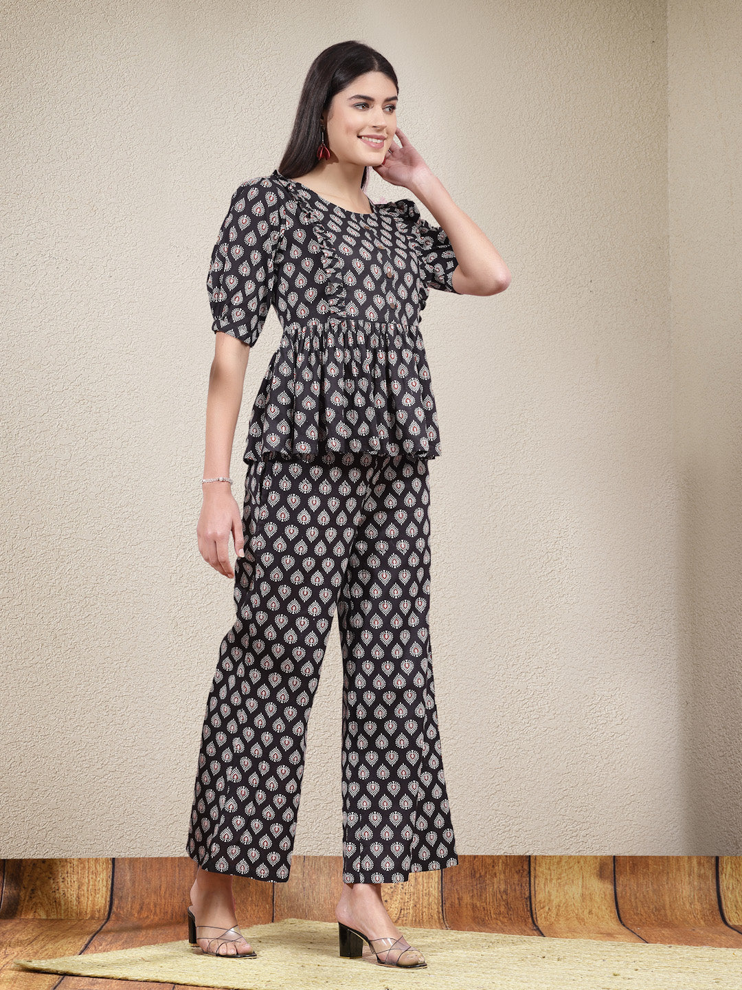 Black ethnic motif printed co-ord set in cotton fabric. Top has round neckline, button detailing on front placket and ruffles on both side of princess line. Printed flared pant has half elasticated waist band with one sided pocket. Top Length -28" Inch, Pant Length - 38'' Inch. Casual to office wear co-ord set.