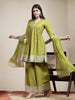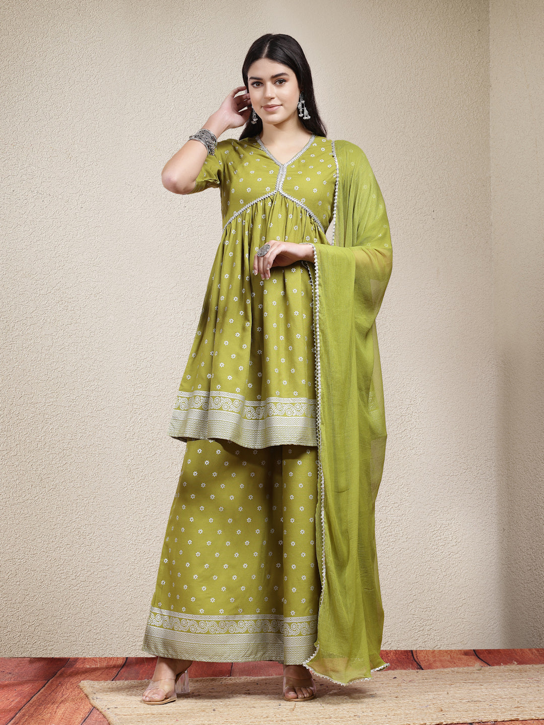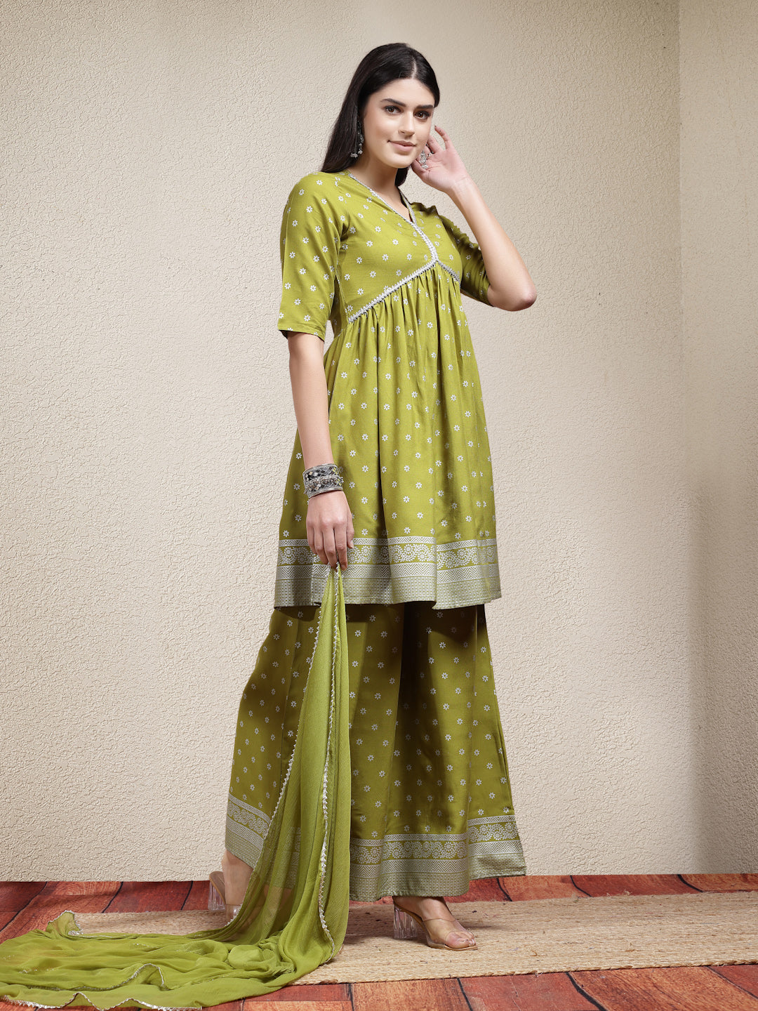Stylum Women's Ethnic Motif Printed Naira Cut Rayon Kurta Palazzo Dupatta Set (KPDGREENSANJH)