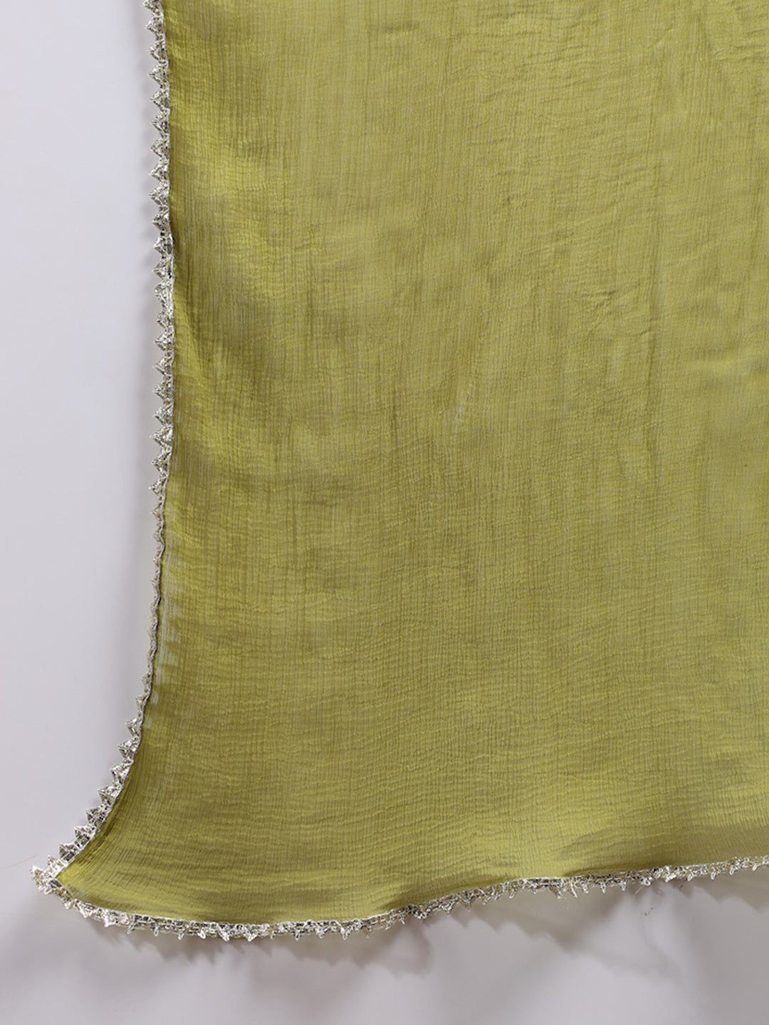 Green silver ethnic motif printed rayon naira cut short kurta with border print design and lace detailing on yoke, printed wide palazzo which has full elasticated waistband and solid chiffon dupatta with lace attachment. Kurta Length- 34" Inch, Palazzo length - 38'' Inch and Dupatta length - 2.30 mtr.