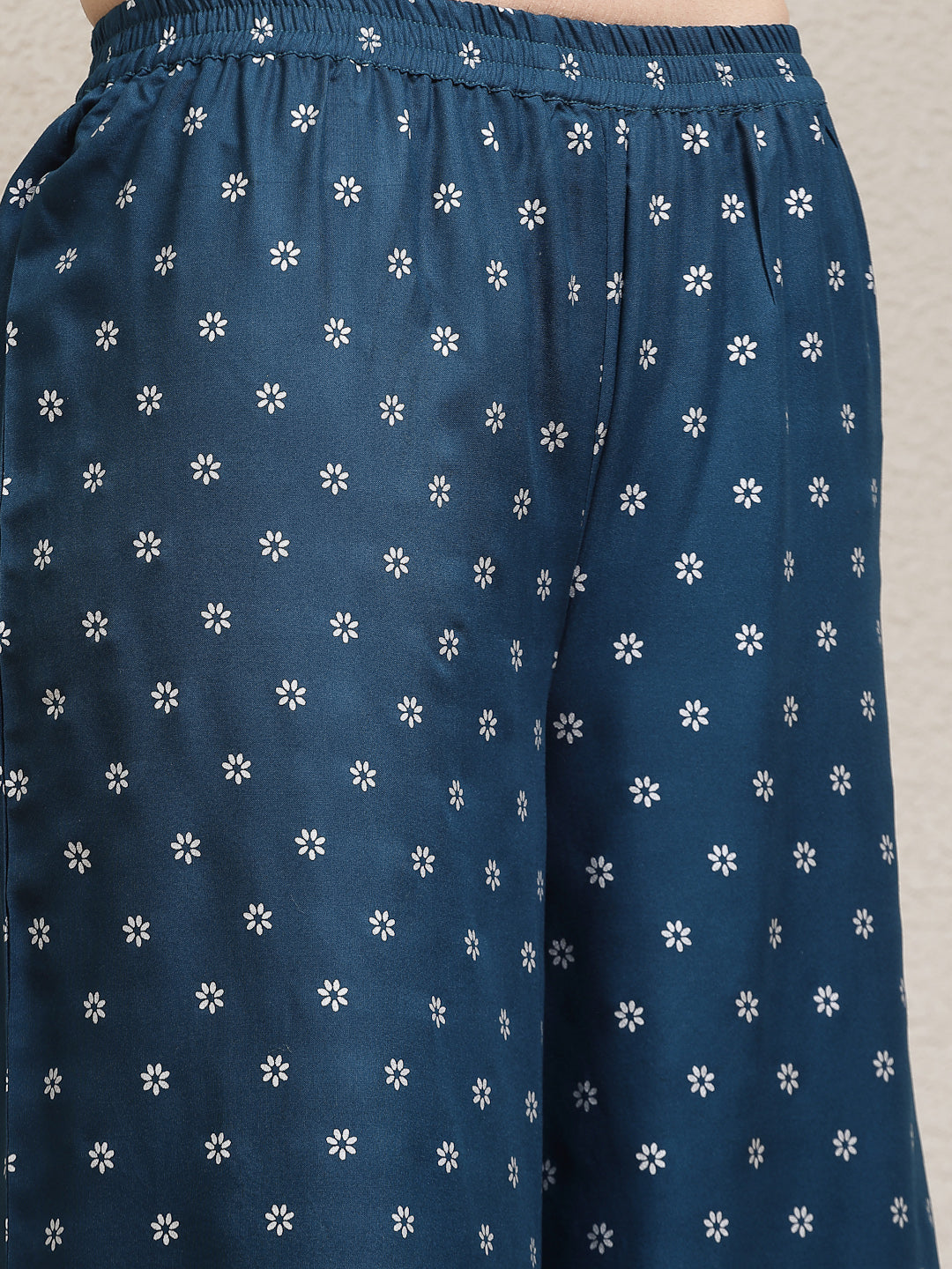 Teal ethnic motif printed rayon naira cut short kurta with border print design and lace detailing on yoke, printed wide palazzo which has full elasticated waistband and solid chiffon dupatta with lace attachment. Kurta Length- 34" Inch, Sharara length - 38'' Inch and Dupatta length - 2.30 mtr.
