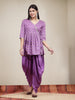 Purple boota printed kurta dhoti set in Rayon fabric. Angrakha style with side dori. Lace attached on neckline. Solid dhoti has full elasticated waist. Kurta Length- 34" Dhoti length - 39''. Festive wear outfit.