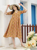 Mustard floral printed midi dress in cotton fabric with v-neck collared neckline, wooden button detailing on placket and puffed sleeves with gathers. Dress Length -44'' Inch.