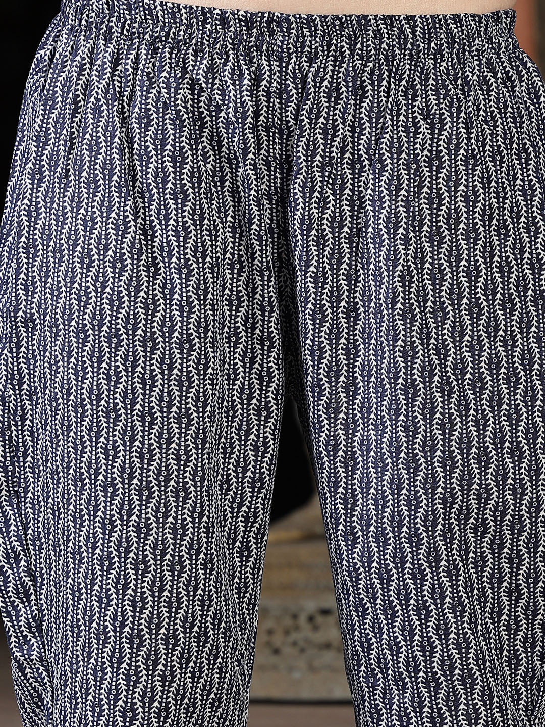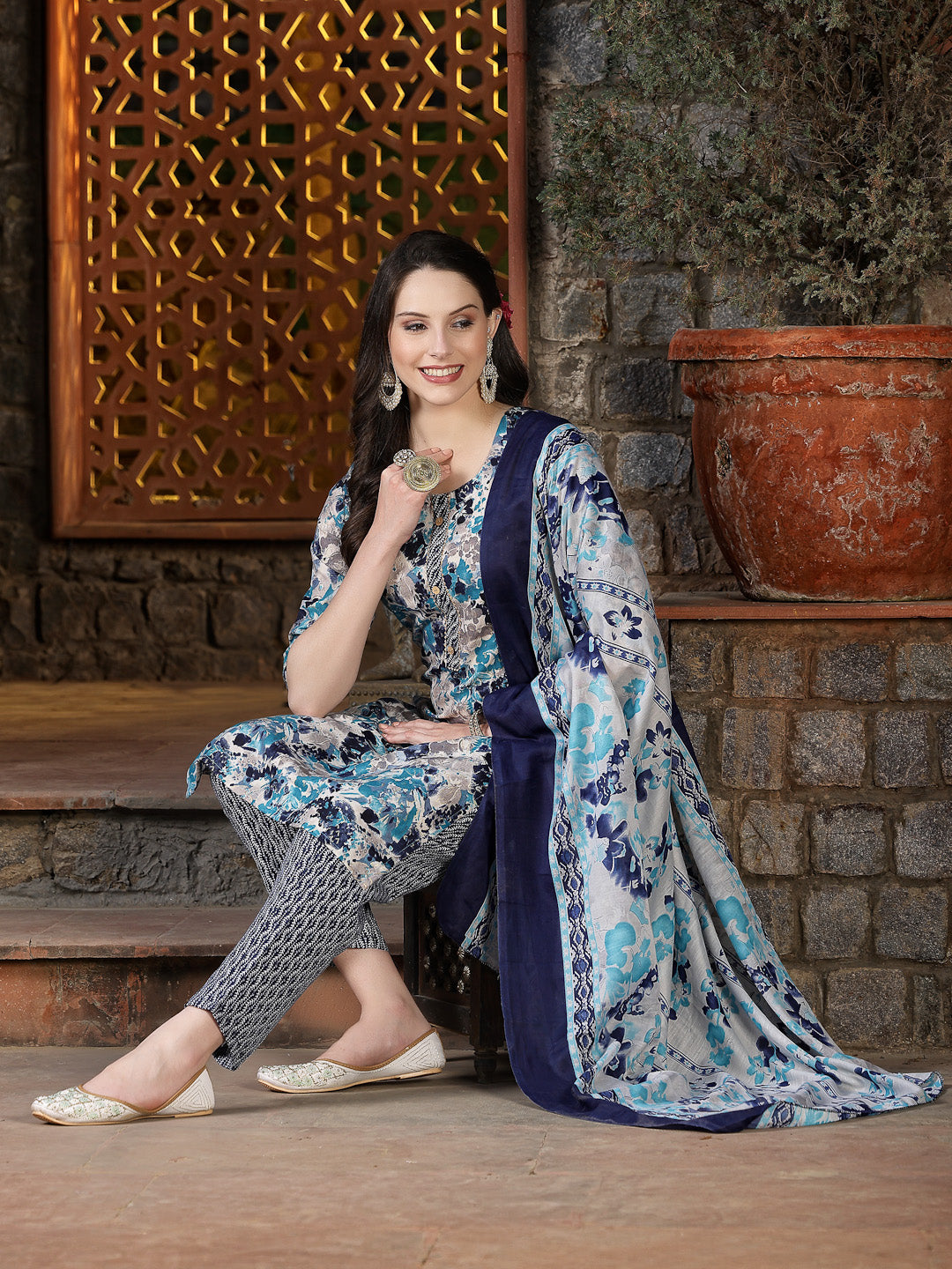 Turquoise blue floral printed cotton blend straight kurta with wooden button detailing on placket. Printed pant which has full elasticated waistband. Dupatta is in printed cotton blend fabric. Kurta Length- 42" Inch, Pant Length - 38" Inch and Dupatta length - 2.10 mtr.