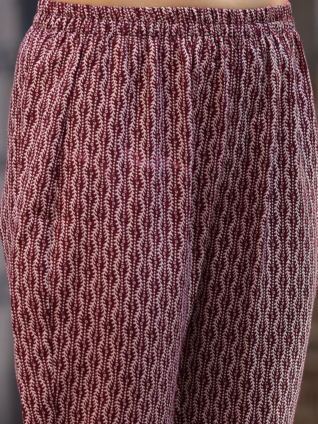 Pink floral printed cotton blend straight kurta with wooden button detailing on placket. Printed pant which has full elasticated waistband. Dupatta is in printed cotton blend fabric. Kurta Length- 42" Inch, Pant Length - 38" Inch and Dupatta length - 2.10 mtr.