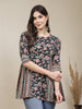 Black floral printed kantha cotton peplum top has both side panel on front, functional placket with Buttons and cuffs on sleeves. Top Length-28" Inch.