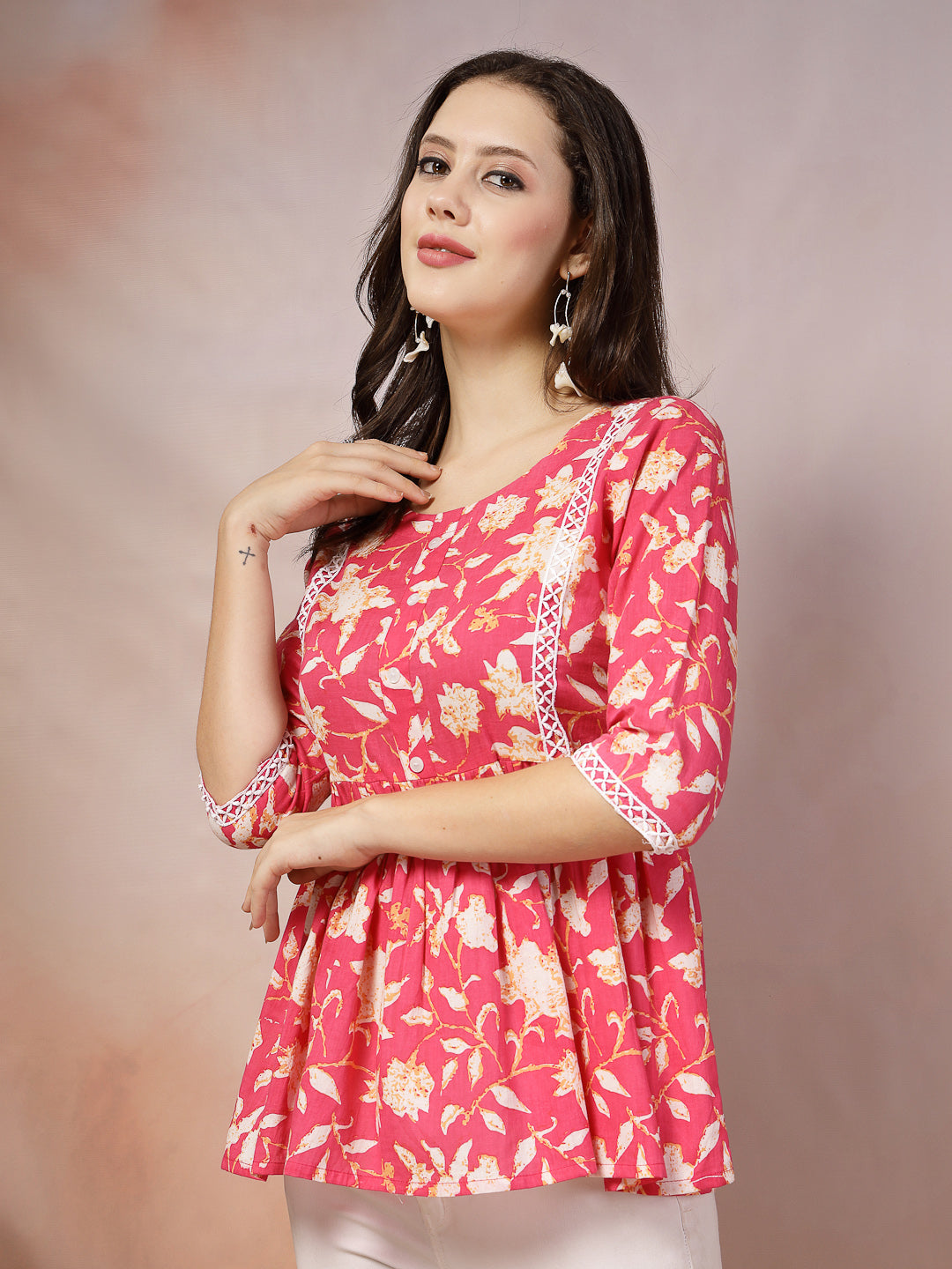 Pink floral printed cotton peplum top embellished with cotton lace on princess line of yoke & sleeves and buttons on front placket. Top. Length-28" Inch.