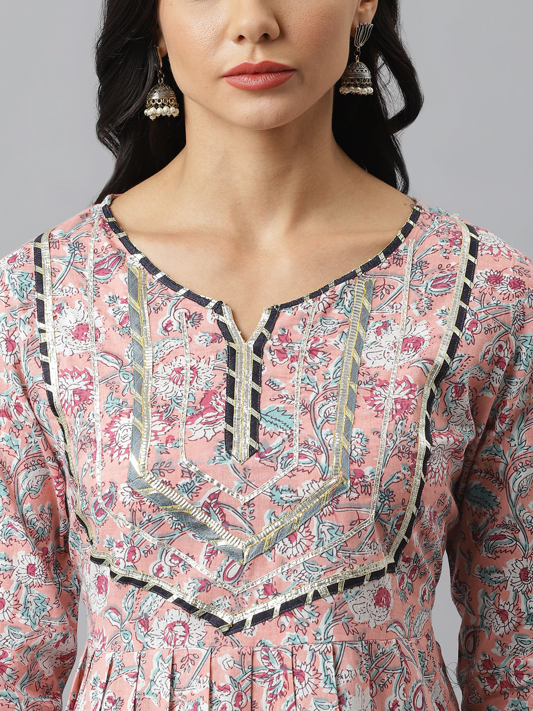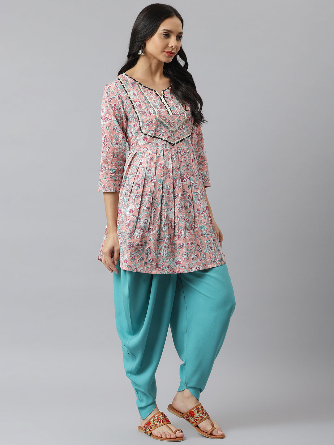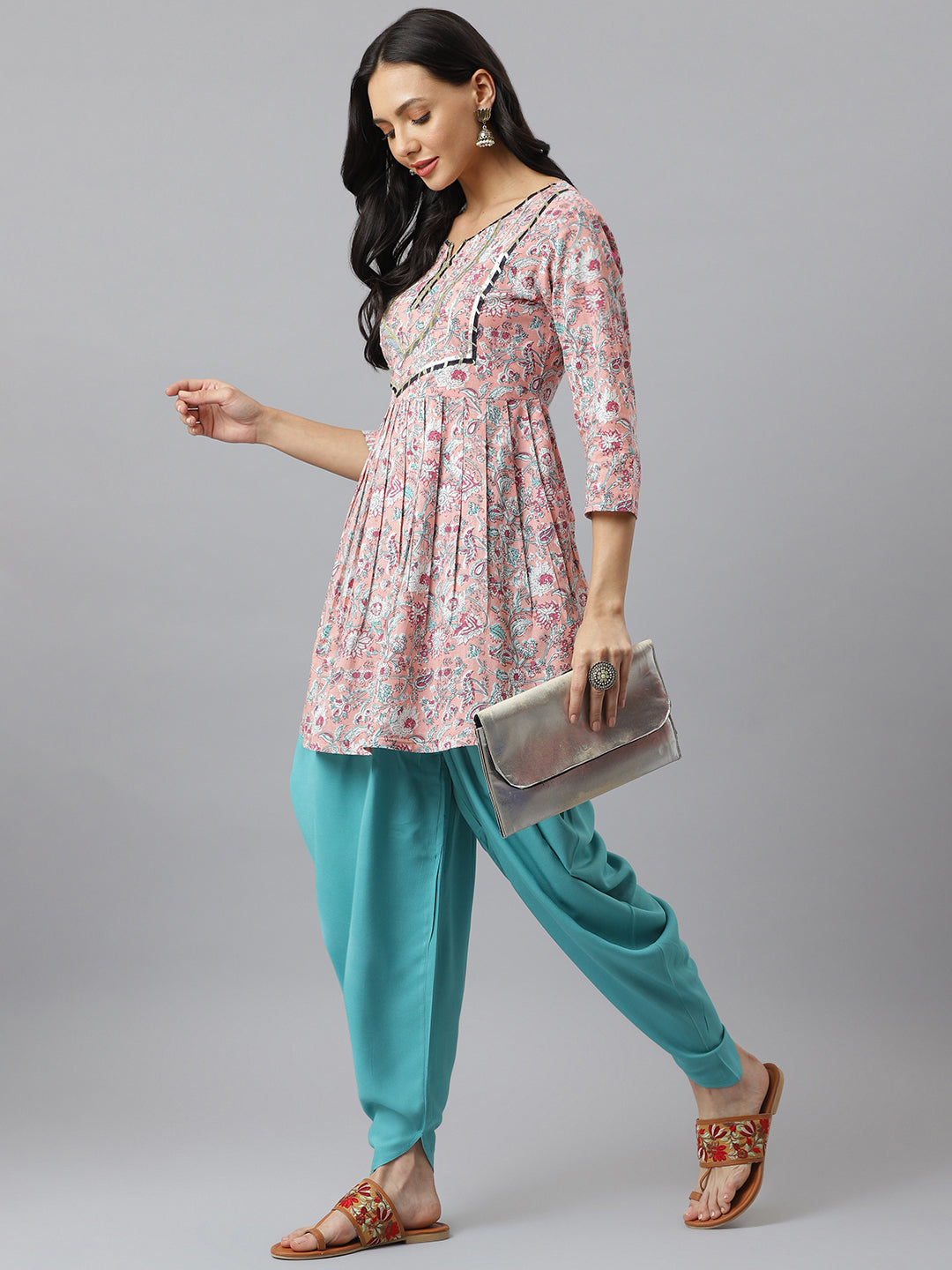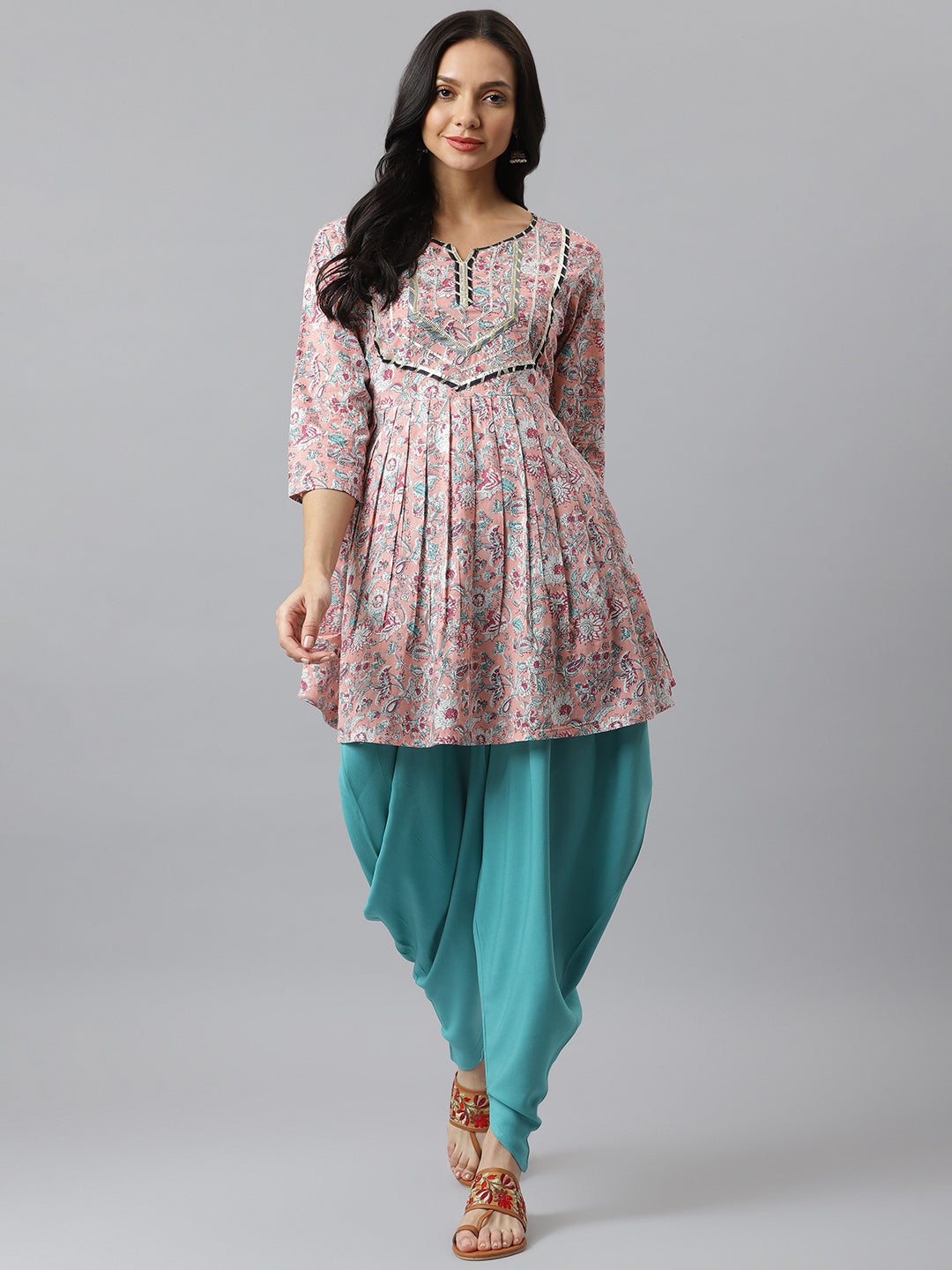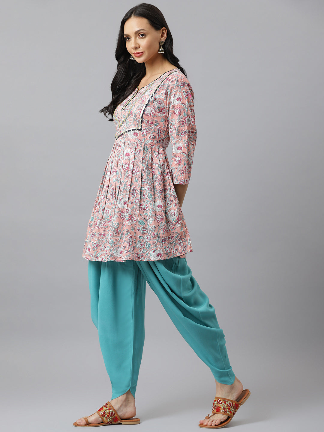 Stylum Women's Floral Printed Cotton Pleated Kurta Dhoti Pant Set (Kdimaralpink)