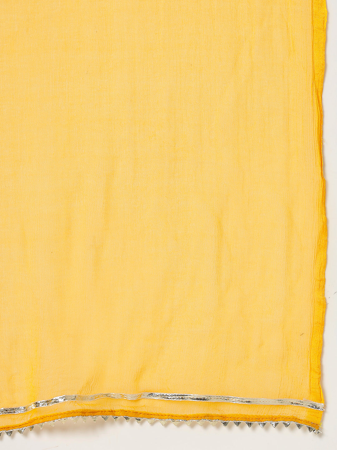 | Pink floral printed cotton kurta with v-neckline and lace detailing, printed palazzo which has full elasticated waistband and solid chiffon dupatta. Products Kurta Length-46" inch, palazzo length-38" inch and Dupatta Length- 2.30 Mtr. Pair it with stunningÃÂ jewellery and heels to flaunt yourself. |