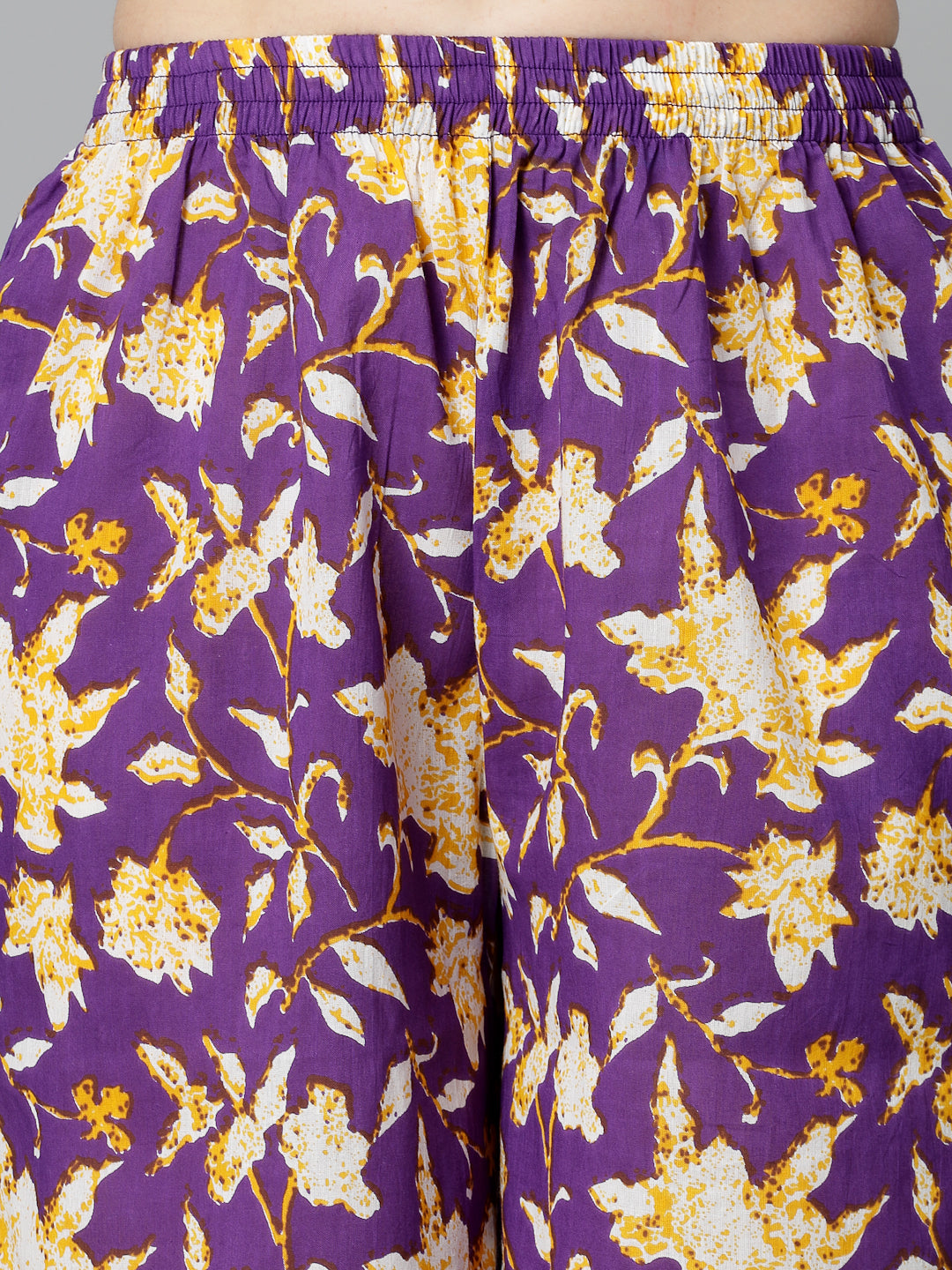 Get ready to make a fashion statement with Stylumââ¬â¢s floral cotton printed pleated kurta palazzo dupatta set. A stunning ensemble that exudes elegance. Crafted from high-quality cotton fabric, this kurta palazzo dupatta set features a violet floral printed kurta with a flattering v-neckline and lace detailing that adds a feminine appeal. It is paired with printed palazzo pants that are not only stylish but also allow for easy movement making them just perfect for every occasion. The cotton kurta set for women is completed with a solid chiffon dupatta that adds beauty to the sut set. Perfect for festive occasions, weddings, or any special event, our Floral Printed Cotton Pleated Kurta Palazzo Dupatta Set is a must-have addition to your wardrobe.