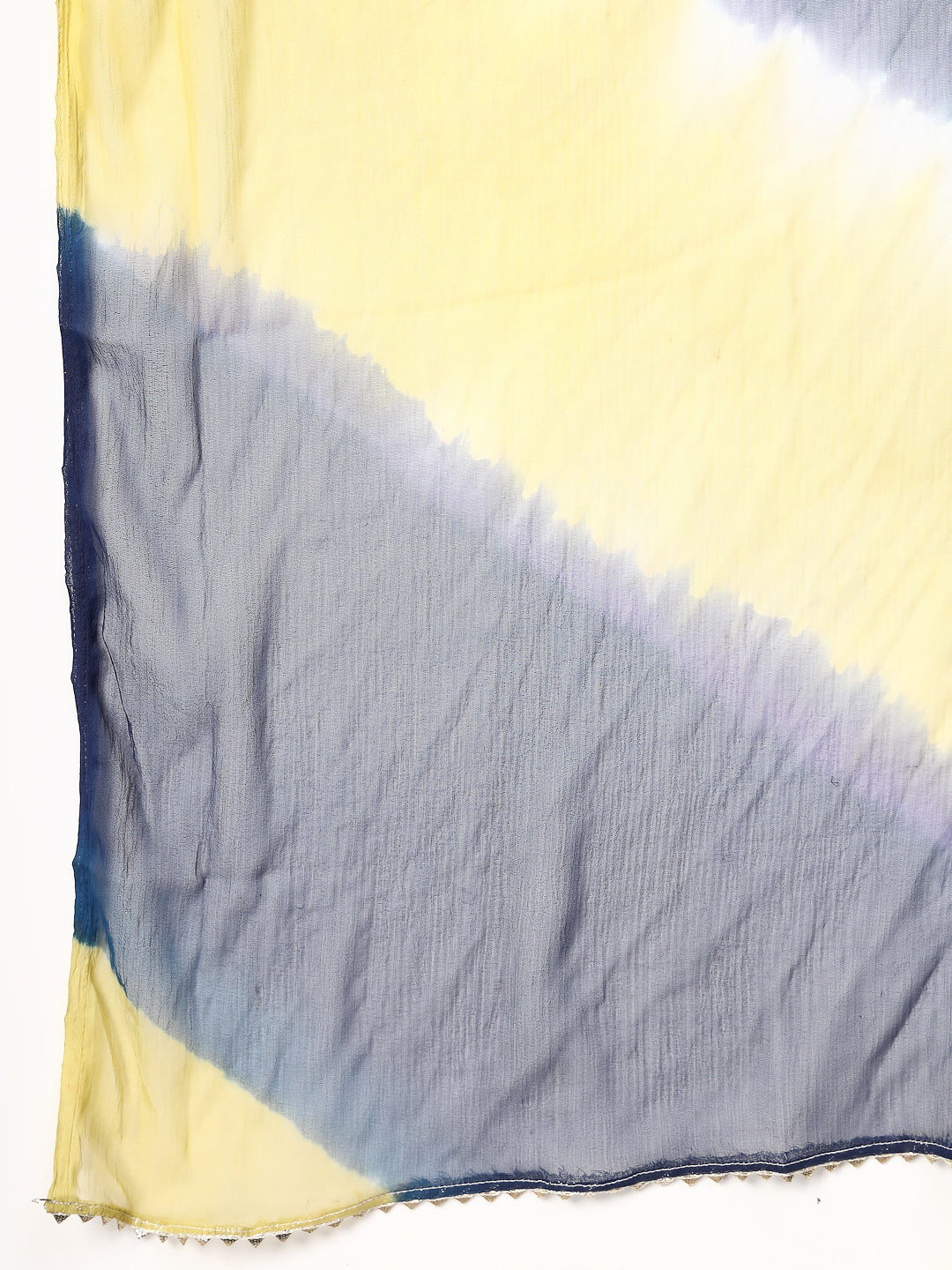 Blue floral printed cotton kurta with v-neckline and lace detailing, printed pant which has full elasticated waistband and lehariya chiffon dupatta. Products Kurta Length- 46" inch, pant length- 38" inch and Dupatta Length- 2.30 Mtr. Pair it with stunning jewellery and heels to flaunt yourself.