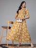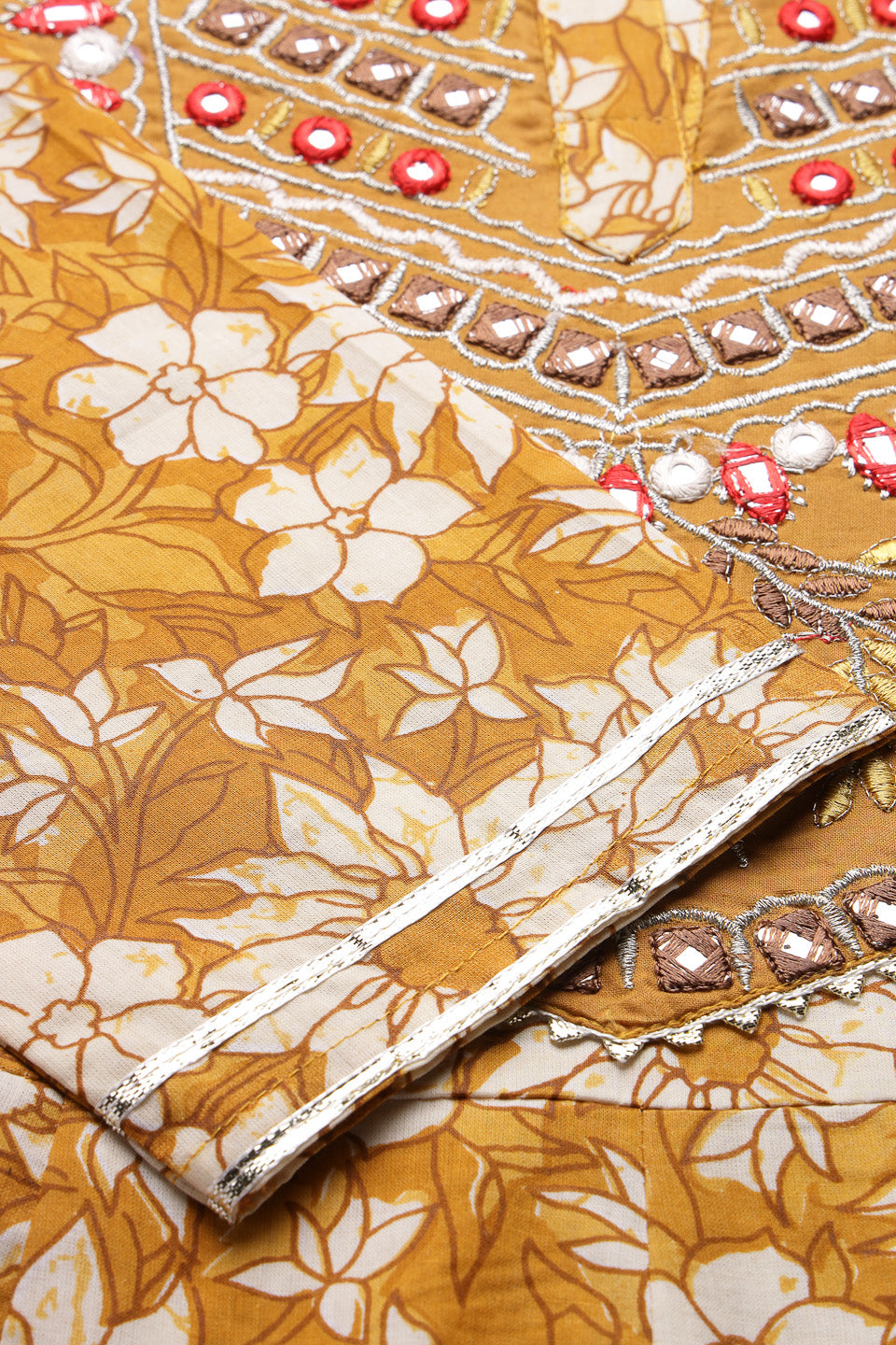 Mustard floral printed cotton long anarkali kurta. It has embroidery on yoke, lace attachment on sleeves and gheri. Pair it with beautiful jutties and jhumkas. Products Length- 52" Inch