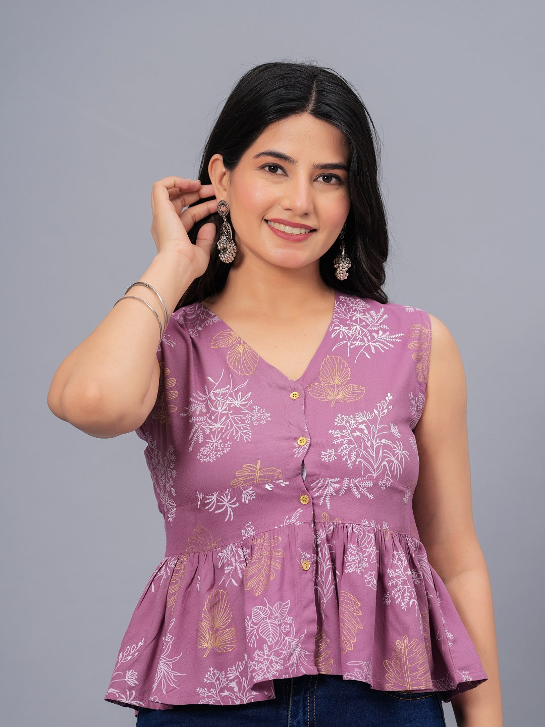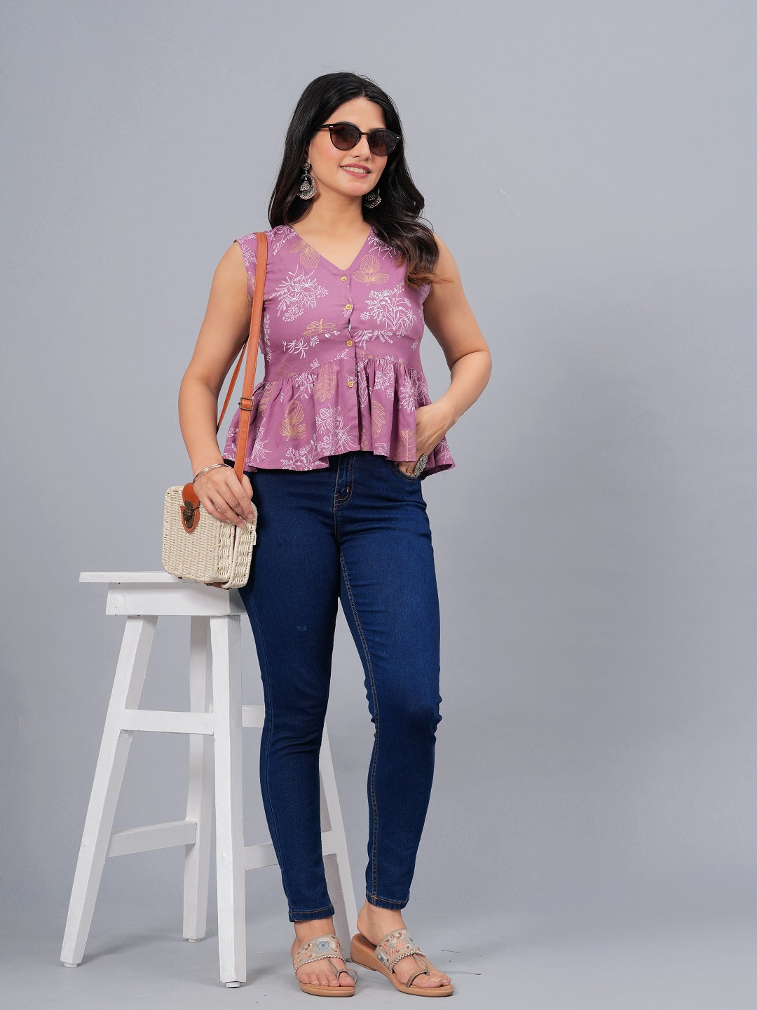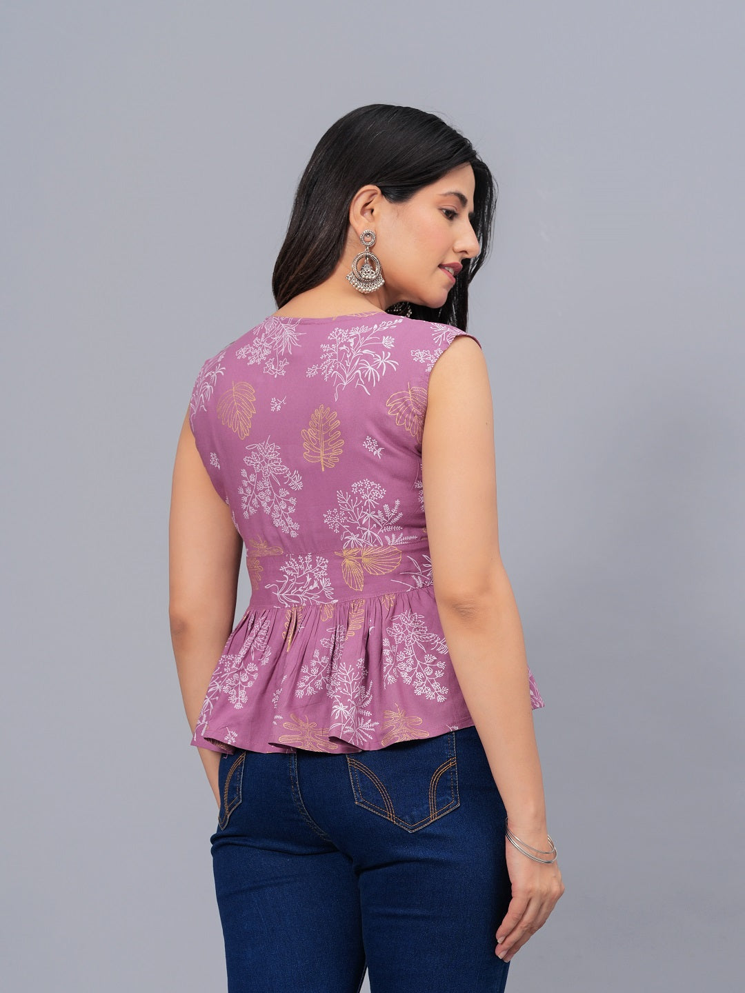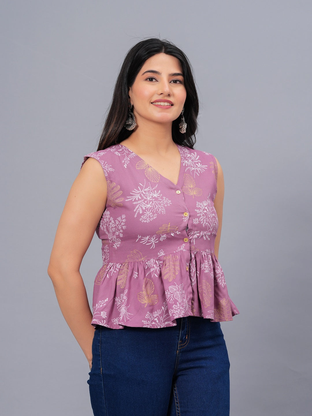 Mauve Floral printed V- neck peplum top. Front Functional Placket with shell button. Sleeve less top with belt detailing on waist. Top length - 20'', Casula wear top. Â