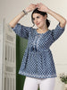 Blue Geometric printed rayon peplum top. This trendy top has adjustable dori neck with ruffled 3/4th Sleeves. Top Length-28.5" Inch.