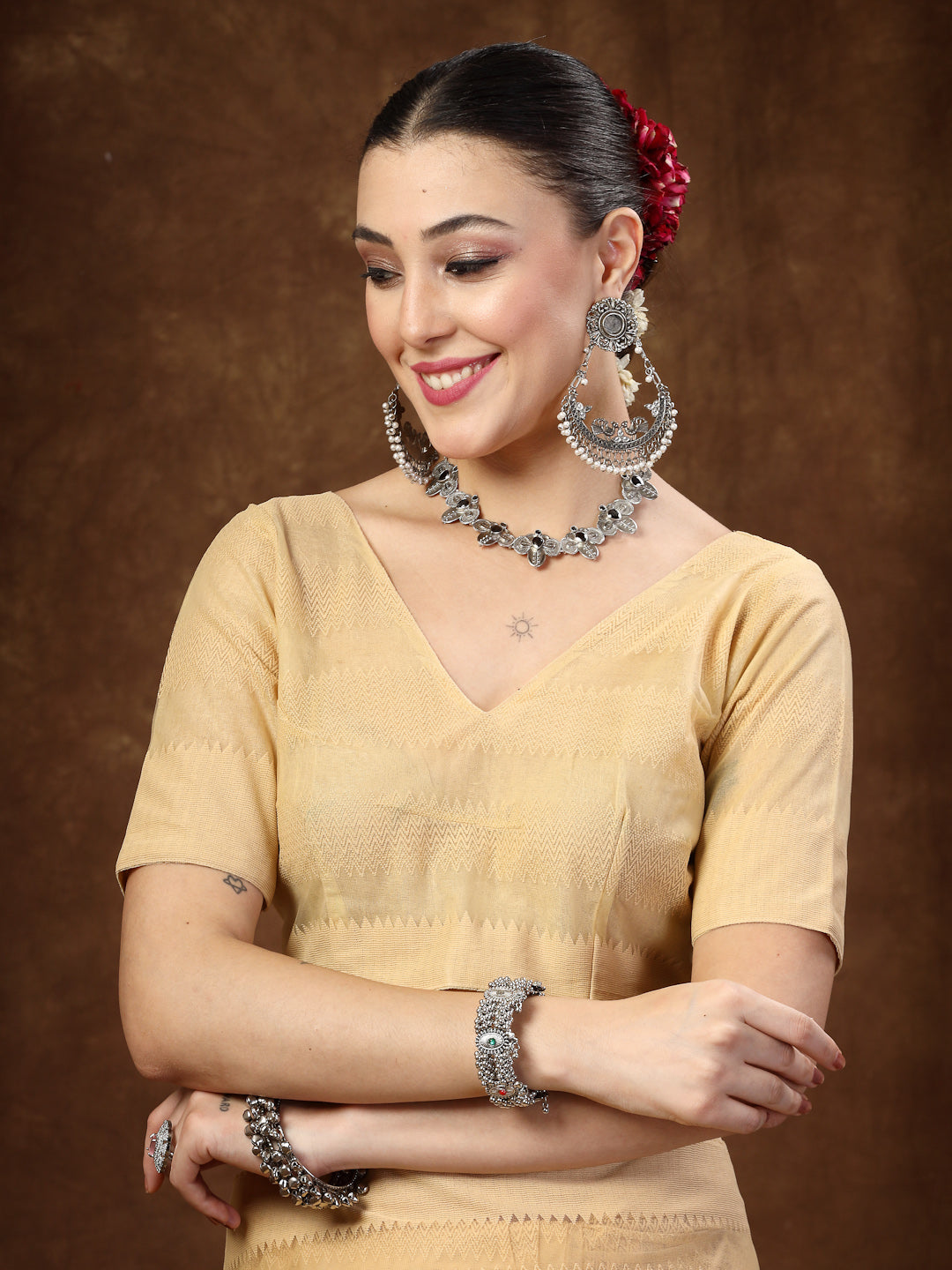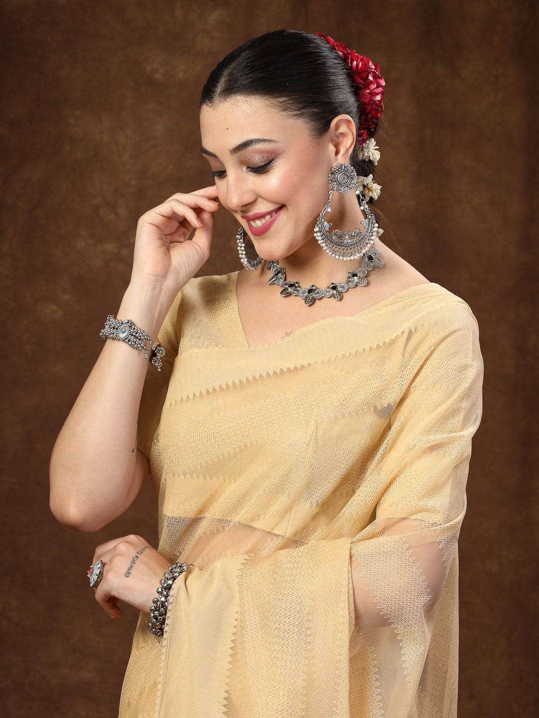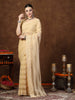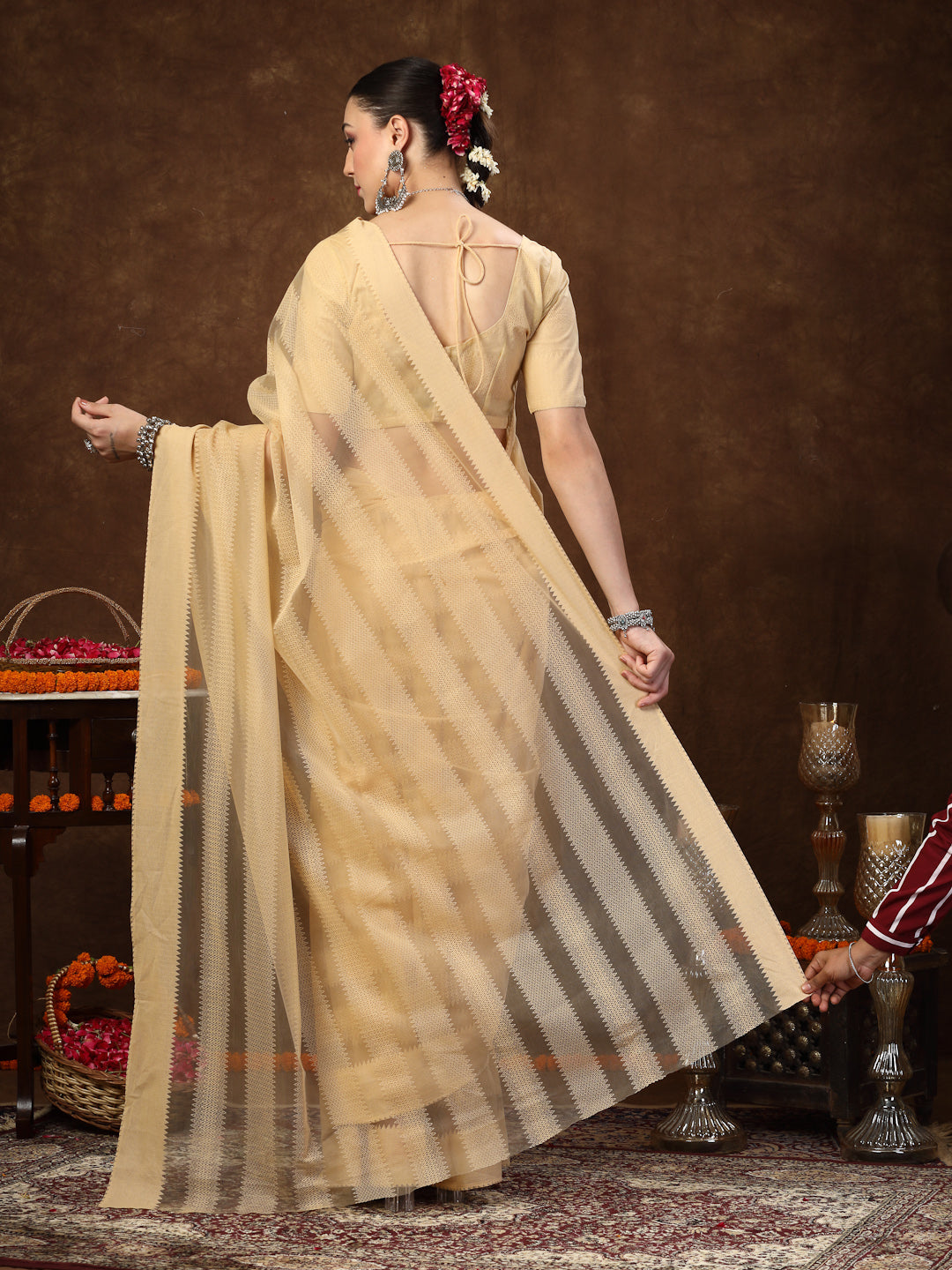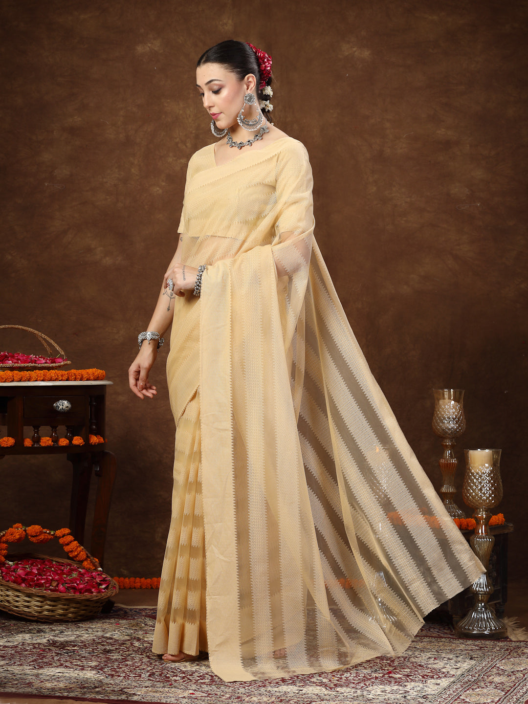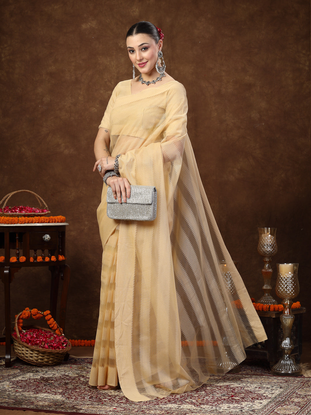 Gold ethnic stripe embroidered net saree. This ethnic saree has embroidered border. Saree has unstitched blouse. Length - 5.30 mtr, Blouse - .80 mtr