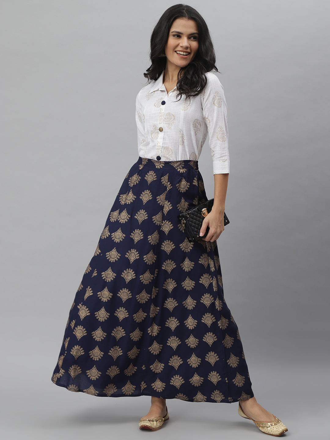 Be sure to make a lasting impression wherever you go with this Women's Gold Print Cotton Blend Shirt Skirt Set from Stylum. This gorgeous set features a beautiful combination of off-white and blue, making it perfect for any festival or party. The contemporary yet trendy design is sure to turn heads and make you the centre of attention. Made from high-quality rayon fabric, this long skirt and shirt set is ultra-comfortable and easy to wear. The skirt also features elastic in the back, ensuring a perfect fit for all body types. Get it today and slay!