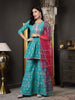 Feel special With this turquoise kurta, sharara and dupatta set in rayon fabric. It is a printed short length colorful lace detailed kurta with three-quarter sleeves. Printed turquoise sharara has full elasticated waistband. Pink dupatta in net fabric has gota lace embellishment all-over. Products Kurta Length-32" Inch, sharara length-38" Inch and Dupatta Length- 2.30 Mtr.