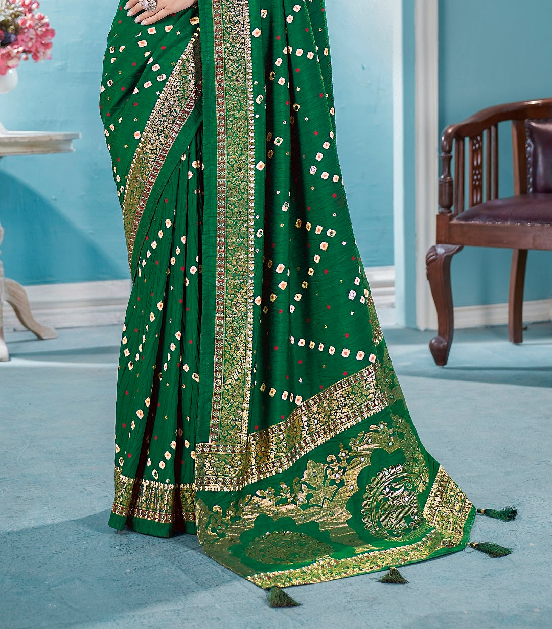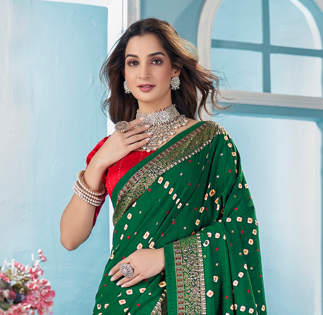 Green traditional bandhani tussar silk saree. Crushed silk saree with mirror aari work and foil borde. It has unstitch blouse. Saree Length - 5.50 Mtr, Blouse Fabric Length - 0.80 Mtr
