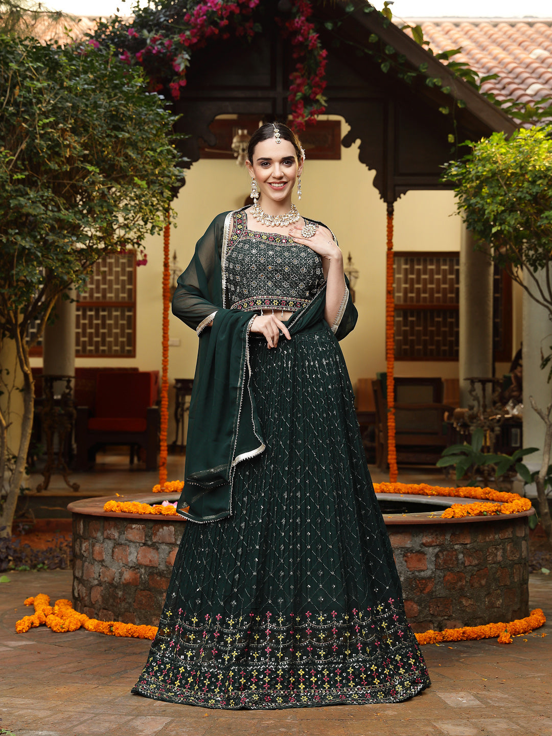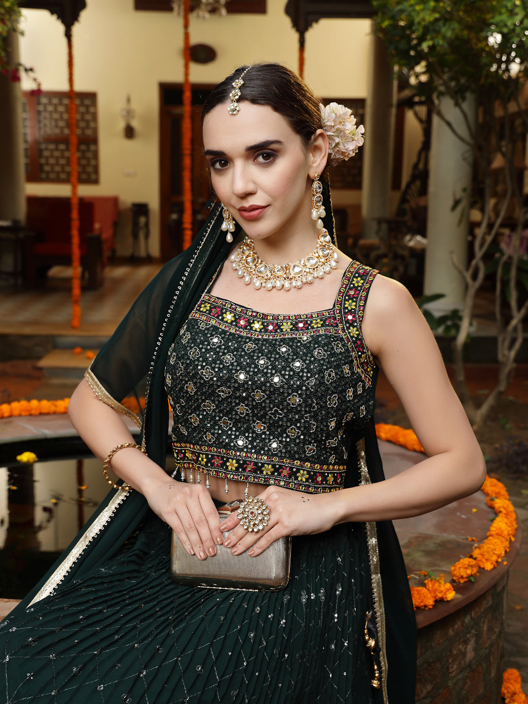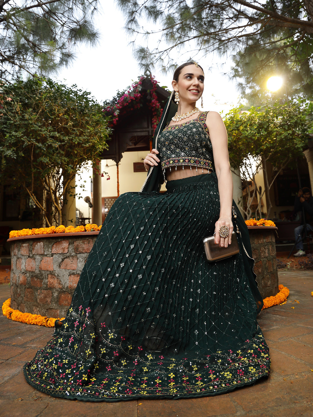 Green embroidered georgette lehenga with heavy blouse and dupatta. This lehenga has sleeves fabric inside. Lehenga length- 42'' Inch, blouse length- 15'' Inch, Dupatta Length:- 2.50 Mtr.