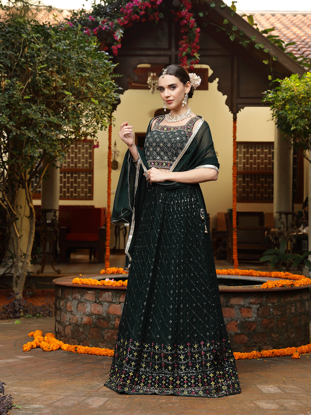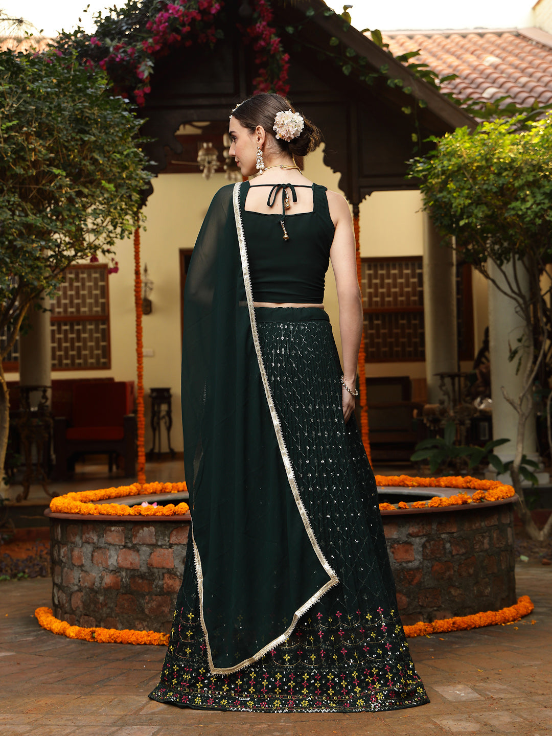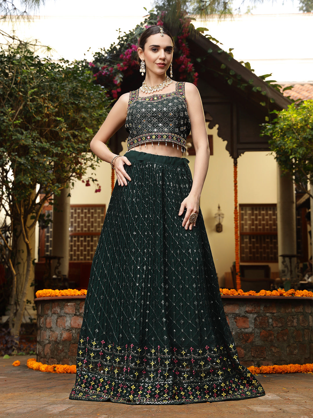 Green embroidered georgette lehenga with heavy blouse and dupatta. This lehenga has sleeves fabric inside. Lehenga length- 42'' Inch, blouse length- 15'' Inch, Dupatta Length:- 2.50 Mtr.