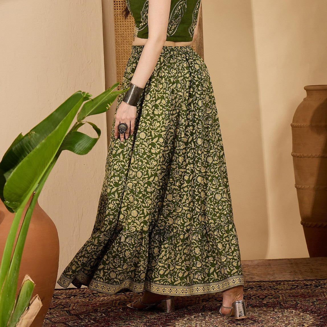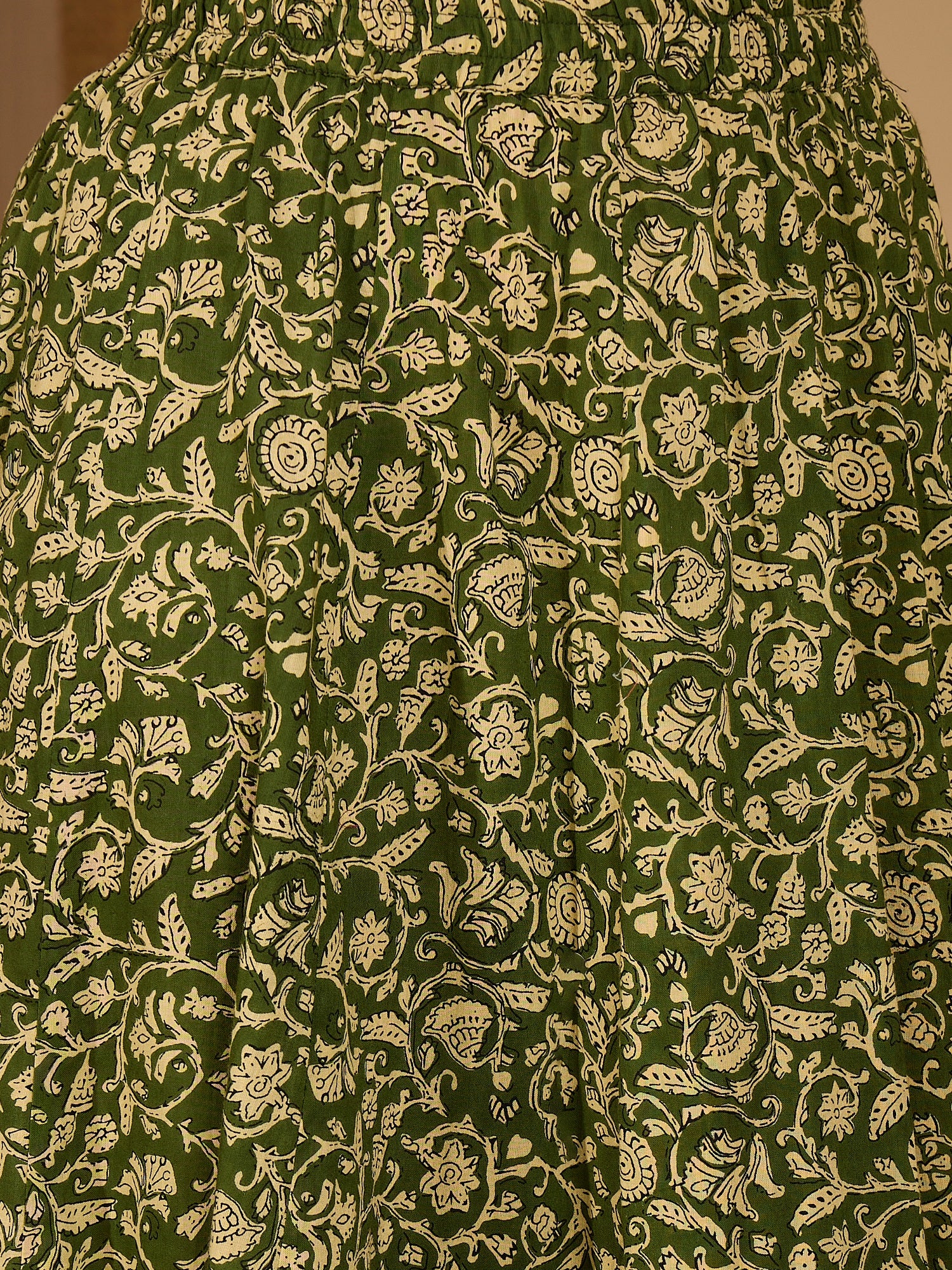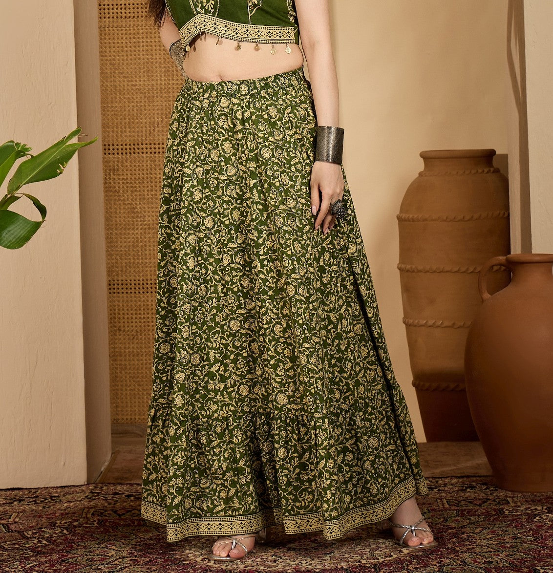 Green cotton ethnic printed tiered skirt with fully elasticated waistband. Skirt Length- 40'' Inch.