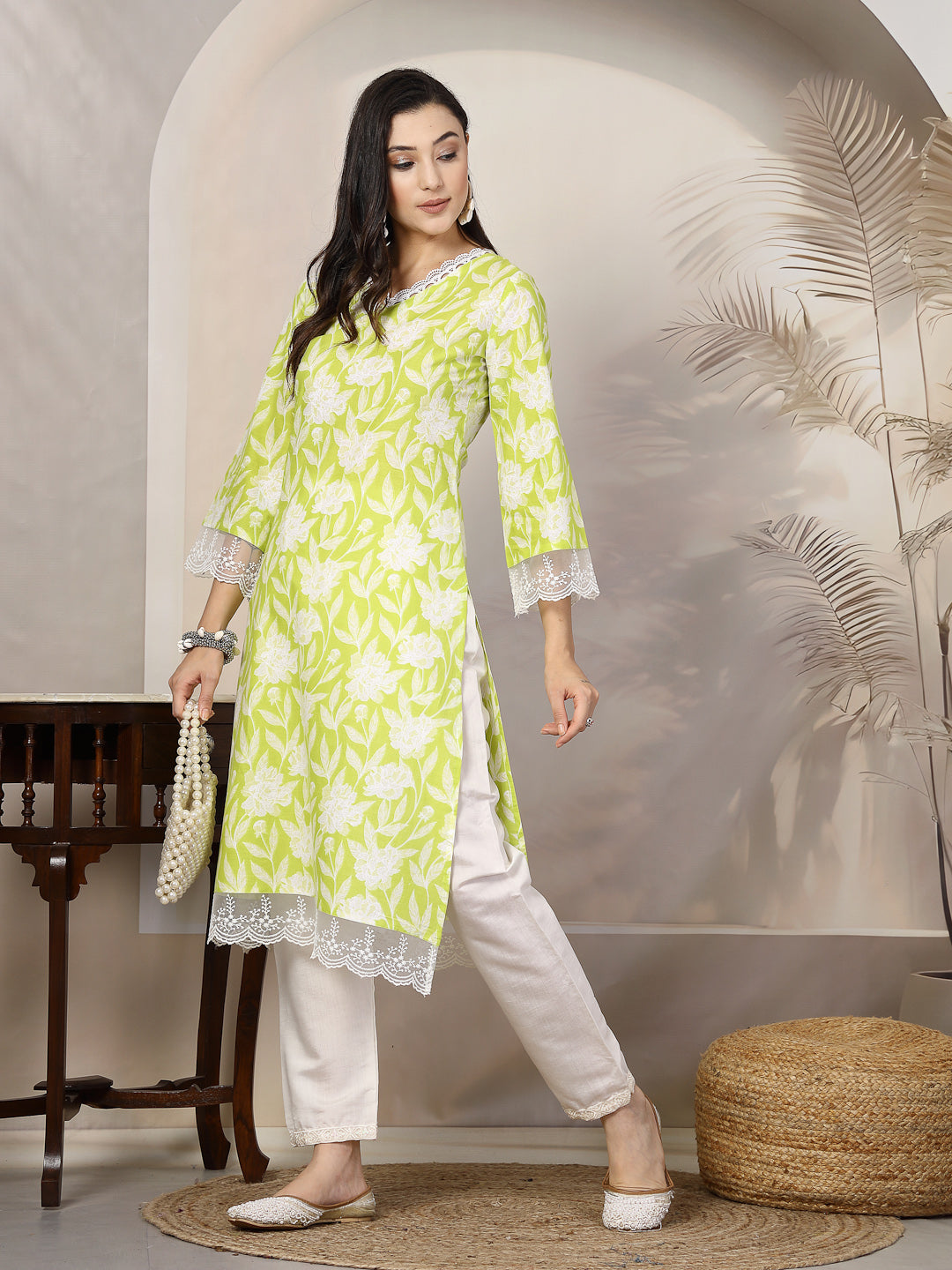 Green cotton floral printed V-neck pakistani kurta. Kurta has lace detailing on neck line and sleeves. Kurta Length-45" Inch.