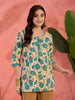 Green floral printed cotton straight top has front placket with mirror work and tassels, kantha work on yoke and sleeves and printed border on sleeves and straight line. Top Length-28" Inch.