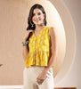 Yellow Ikat printed V- neck peplum top. Front Functional Placket with shell button. Sleeve less top with belt detailing on waist. Top length - 20'', Casula wear top.ÃÂ