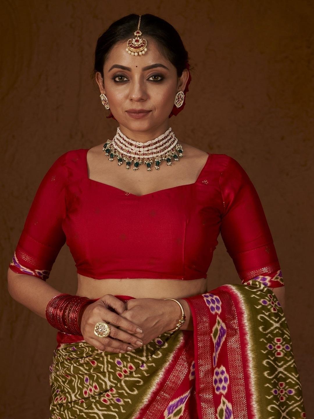 Green and maroon printed silk saree. Ikat printed saree with woven design border. Has soft skin friendly zari detail. Beautiful saree to be wear from a casual ceremony day to office wear. The Saree comes with an unstitched blouse piece. The blouse worn by the model might be for modelling purpose only. Check the image of unstitch blouse piece to understand how the actual blouse looks like. Saree Length- 5.5 Mtr, Blouse Piece Width- 1.06 Mtr