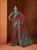 Maroon and green printed silk saree. Ikat printed saree with woven design border. Has soft skin friendly zari detail. Beautiful saree to be wear from a casual ceremony day to office wear. The Saree comes with an unstitched blouse piece. The blouse worn by the model might be for modelling purpose only. Check the image of unstitch blouse piece to understand how the actual blouse looks like. Saree Length- 5.5 Mtr, Blouse Piece Width- 1.06 Mtr