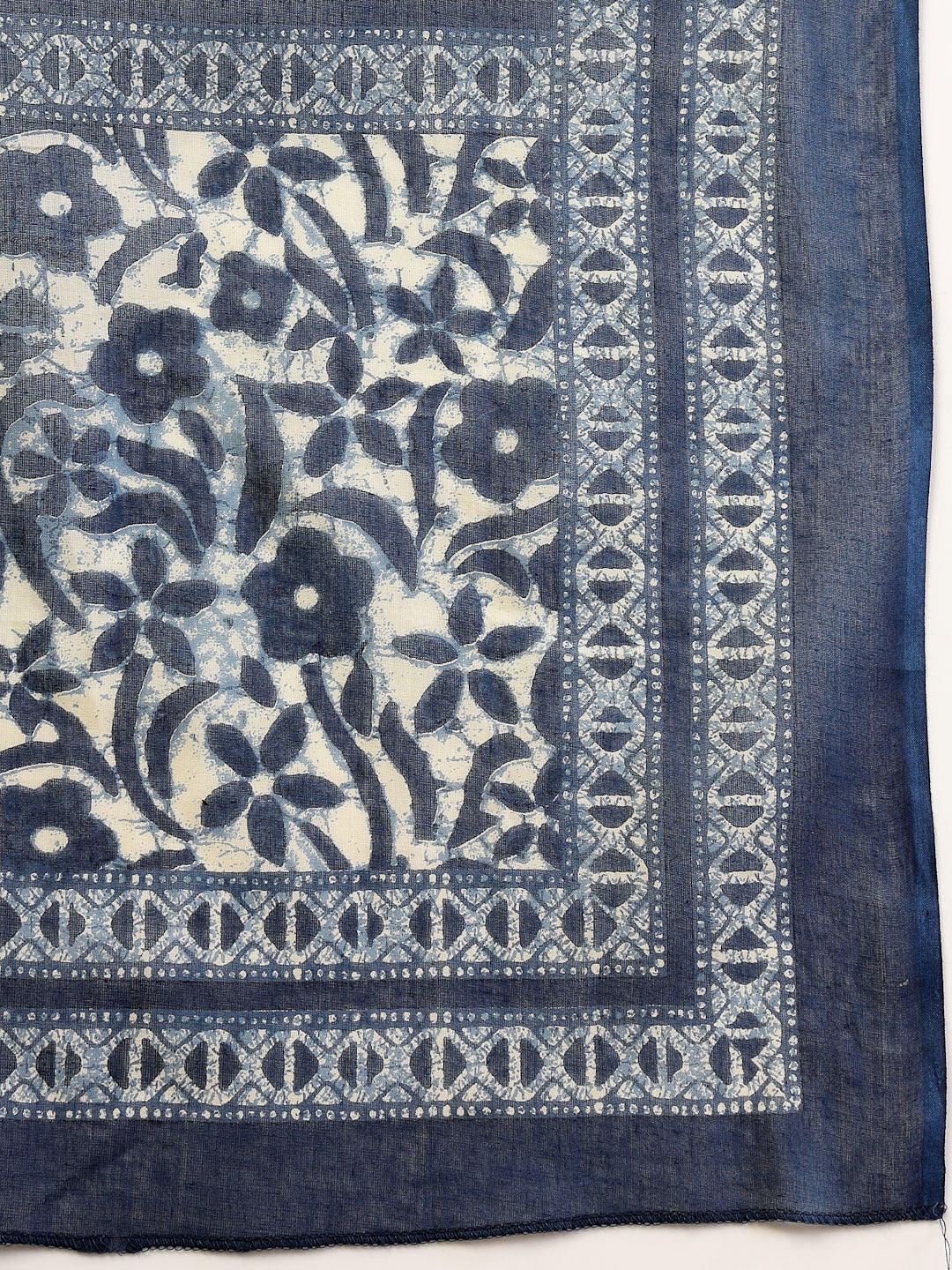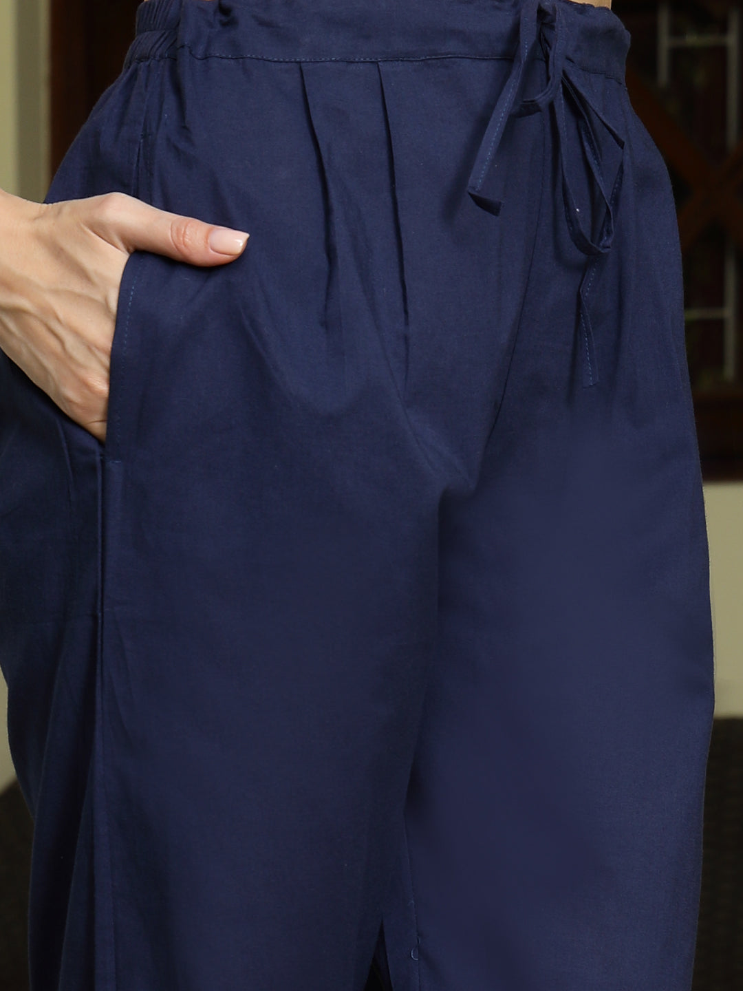 Indigo jaipuri printed and embroidered kurta pant and dupatta set in cotton fabric. It is an a-line and mandarin collar kurta. Has kantha and sequience embroiderey. Kurta Length- 45" Inch, Pant Length- 38" Inch, Dupatta Length- 2.30 Mtr. Cab be paired with oxidised jewellery.