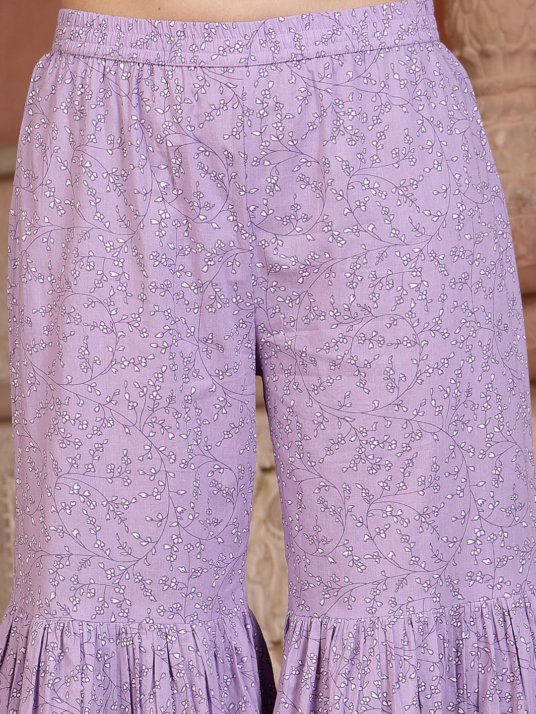 Lavender cotton strappy floral printed flared kurti sharara and dupatta set. Kurta has beautiful embroidery in neckline and flair. Sharara is fully elasticated. Cotton mulmul printed dupatta. Kurta Length- 37" Inch, Pant Length - 38'' Inch, Dupatta Length - 2.30 mtr.