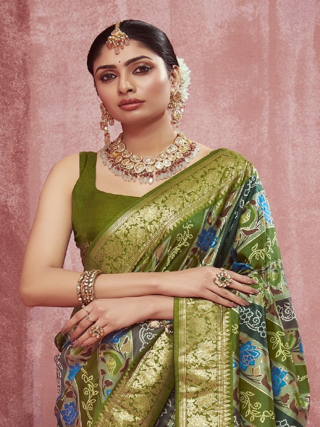 Mehndi Green printed silk saree. Leheriya & Bandhe printed saree with woven design border. Has soft skin friendly zari detail. Beautiful saree to be wear from a casual ceremony day to office wear. The Saree comes with an unstitched blouse piece. The blouse worn by the model might be for modelling purpose only. Check the image of unstitch blouse piece to understand how the actual blouse looks like. Saree Length- 5.5 Mtr, Blouse Piece Width- 1.06 Mtr
