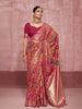 Pink printed silk saree. Leheriya & Bandhe printed saree with woven design border. Has soft skin friendly zari detail. Beautiful saree to be wear from a casual ceremony day to office wear. The Saree comes with an unstitched blouse piece. The blouse worn by the model might be for modelling purpose only. Check the image of unstitch blouse piece to understand how the actual blouse looks like. Saree Length- 5.5 Mtr, Blouse Piece Width- 1.06 Mtr